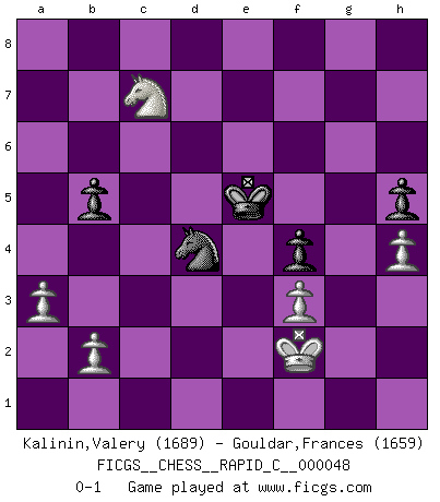 Last move : 0-1 2008 August 17 18:15:57 [Event "FICGS__CHESS__RAPID_C__000048"] [Site "FICGS"] [Date "2008.04.11"] [Round "1"] [White "Kalinin,Valery"] [Black "Gouldar,Frances"] [Result "0-1"] [WhiteElo "1689"] [BlackElo "1659"] 1.e4 c6 2.d4 d5 3.exd5 cxd5 4.c4 Nf6 5.Nf3 Bf5 6.Nc3 e6 7.Ne5 Nbd7 8.cxd5 exd5 9.Bb5 a6 10.Qf3 Be6 11.Ba4 Be7 12.O-O O-O 13.Re1 Nb6 14.Bc2 Rc8 15.Bg5 Nc4 16.Nxc4 Rxc4 17.Qd3 g6 18.Bb3 Rc8 19.Rac1 Re8 20.h3 b5 21.Qe3 Kg7 22.a3 Ng8 23.Bxe7 Nxe7 24.Qe5+ Kg8 25.Qf4 Kg7 26.g4 Qc7 27.Ne2 Qxf4 28.Nxf4 Rxc1 29.Rxc1 Rd8 30.Rc7 Kf6 31.Nd3 Rd7 32.Rxd7 Bxd7 33.Nb4 Be6 34.Nxa6 Nc6 35.Nc7 Nxd4 36.Bxd5 Bxd5 37.Nxd5+ Ke5 38.Nc3 f5 39.gxf5 gxf5 40.Kg2 f4 41.h4 Kf5 42.f3 Kg6 43.Nd5 Kf5 44.Nb4 Ke5 45.Nd3+ Kf5 46.Kf2 h5 47.Nc5 Nc2 48.Na6 Nd4 49.Nc7 Ke5 0-1 This chess game has been lost on time (started : 2008.04.11 18:56:27) Caro-Kann : Panov-Botvinnik attack Kingside Castling by player White (move 12) Kingside Castling by player Black (move 12) Player Black won this chess game. Follow this game move after move (download)There must have been a time when men were demigods, or they could not have invented Chess. (Gustav Schenk) Wer der Ansicht ist, daß alle Schachspieler verrückt sind, wird durch Studium des Lebens von Emil Josef Diemer nicht auf andere Gedanken kommen. (Hans Ree) Un buen sacrificio es aquel que aunque no sea necesariamente sólido, deja a tu oponente aturdido y confuso. (Rudolph Spielmann) Même si vous avez un bon coup à faire, regardez toujours s'il n'y en a pas un qui lui soit préférable. (Pedro Damiano) . 'gn is not allowed in chess unless n is an integer between 1 and 8 inclusive, where 1 and 8 are to interpreted as the standard numerals standing for integers in the ordered real-closed field R, with the *canonical* ordering. (As opposed to, say, an integer in the domain Z[2+i*sqrt(5)] or an integer in some exotic Grothendieck topos). (Normajean Yates)