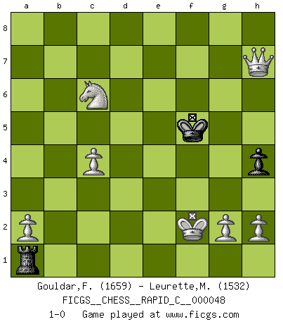 Last move : 1-0 2008 April 18 17:9:24 [Event "FICGS__CHESS__RAPID_C__000048"] [Site "FICGS"] [Date "2008.04.11"] [Round "1"] [White "Gouldar,Frances"] [Black "Leurette,Marc-Antoine"] [Result "1-0"] [WhiteElo "1659"] [BlackElo "1532"] 1.e4 e5 2.f4 exf4 3.Nf3 g5 4.Bc4 g4 5.O-O gxf3 6.Qxf3 Qf6 7.e5 Qf5 8.d4 Nc6 9.c3 d6 10.Bxf4 Be6 11.d5 Na5 12.Bd3 Qg4 13.dxe6 Qxe6 14.exd6 Bxd6 15.Bxd6 cxd6 16.Na3 Kd8 17.Rae1 Qd7 18.Nb5 h5 19.Qg3 f6 20.Bf5 h4 21.Re8+ Kxe8 22.Bxd7+ Kxd7 23.Qxd6+ Ke8 24.Nc7+ Kf7 25.Nxa8 Nc6 26.Qd7+ Kg6 27.Qxb7 Nge7 28.Nc7 Rb8 29.Qa6 Rxb2 30.Nd5 Kh6 31.Rxf6+ Kg7 32.Nxe7 Kxf6 33.Nxc6 Kg5 34.Qa5+ Kg6 35.Qxa7 Rb1+ 36.Kf2 Ra1 37.c4 Kf5 38.Qh7+ 1-0 KGA : Muzio gambit Kingside Castling by player White (move 5) 10 pieces endgame at move 35 : White KQNPPPP , Black KRP WHITE : King + 1 Queen 1 Knight 4 Pawns BLACK : King + 1 Rook 1 Pawn Player White won this chess game. Follow this game move after move (download)Fischer prefers to enter Chess history alone. (Miguel Najdorf) Fischer: 'Remis!?' Uhlmann: 'Aber es muss doch dreimal Zugwiederholung sein!' Fischer: 'Sie nehmen das Remis an, wie ich es sage, sonst spiele ich weiter und werde Sie dann schlagen!' (Robert James Fischer) Uno por uno, yo los acribillé, mi superioridad muy pronto se volvio aparente. (Jose Capablanca) Avant la finale, les dieux ont créé le milieu de partie. (Tarrasch) This is where the fun begins. (Anakin Skywalker in Star Wars ep.3)