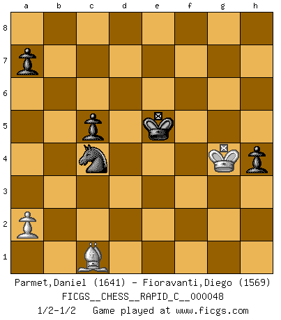 Last move : 1/2-1/2 2008 September 10 22:49:42 [Event "FICGS__CHESS__RAPID_C__000048"] [Site "FICGS"] [Date "2008.04.11"] [Round "1"] [White "Parmet,Daniel"] [Black "Fioravanti,Diego"] [Result "1/2-1/2"] [WhiteElo "1641"] [BlackElo "1569"] 1.d4 f5 2.Nf3 Nf6 3.c4 b6 4.g3 Bb7 5.Qd3 e6 6.Bg2 Be4 7.Qb3 c5 8.Nbd2 Bb7 9.d5 Bd6 10.O-O O-O 11.Rd1 Na6 12.dxe6 dxe6 13.Ng5 Bxg2 14.Kxg2 Qe7 15.Qa4 Nc7 16.Nb1 e5 17.Nc3 h6 18.Nf3 f4 19.Qc6 Rad8 20.Nh4 Qe6 21.b3 g5 22.Nf3 e4 23.Ne1 Be5 24.Qxe6+ Nxe6 25.Bb2 fxg3 26.hxg3 Ng4 27.Rxd8 Rxd8 28.Rb1 Rd2 29.Ba1 Bxc3 30.Bxc3 Rxe2 31.Rb2 Rxb2 32.Bxb2 Nd4 33.b4 Kf7 34.bxc5 bxc5 35.Ba3 Ne6 36.Bb2 Nf8 37.Nc2 Nd7 38.f3 exf3+ 39.Kxf3 h5 40.Ne3 Nxe3 41.Kxe3 Ke6 42.Ke4 h4 43.gxh4 gxh4 44.Kf4 Nb6 45.Ba3 Kd6 46.Kg4 Nxc4 47.Bc1 Ke5 1/2-1/2 Dutch Kingside Castling by player White (move 10) Kingside Castling by player Black (move 10) 10 pieces endgame at move 43 : White KBPPP , Black KNPPP WHITE : King + 1 Bishop 3 Pawns BLACK : King + 1 Knight 3 Pawns 9 pieces endgame at move 43 : White KBPP , Black KNPPP WHITE : King + 1 Bishop 2 Pawns BLACK : King + 1 Knight 3 Pawns 8 pieces endgame at move 46 : White KBP , Black KNPPP WHITE : King + 1 Bishop 1 Pawn BLACK : King + 1 Knight 3 Pawns This chess game ended in a draw. Follow this game move after move (download)Don't even mention losing to me. I can't stand to think of it. (Bobby Fischer) Auf jeden Fall musst du zuerst Rechtsanwalt werden, damit du deine eigenen Interessen und die deiner Familie vertreten kannst. [Brief an seinen Sohn] (José Raúl Capablanca) Yo no le temo a Spassky. Todos saben que yo soy el mejor. Uno no necesita un torneo para probarlo. (Bobby Fischer) Le profane ne songe pas à la somme de jouissance dont il se prive, qui méconnaît ce jeu aux ressources aussi variées que passionnantes. (Jean-Marie Jeanton-Lamarche) Control your own destiny or someone else will. (Jack Welch)