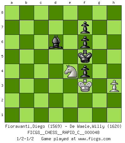 Last move : 1/2-1/2 2008 July 12 21:12:37 [Event "FICGS__CHESS__RAPID_C__000048"] [Site "FICGS"] [Date "2008.04.11"] [Round "1"] [White "Fioravanti,Diego"] [Black "De Waele,Willy"] [Result "1/2-1/2"] [WhiteElo "1569"] [BlackElo "1620"] 1.f4 d5 2.b3 Bg4 3.Bb2 Nc6 4.Nf3 Nf6 5.e3 e6 6.Be2 Bd6 7.O-O O-O 8.Ne5 Bf5 9.Nxc6 bxc6 10.d3 Qe7 11.Qe1 Rab8 12.Nd2 Bc5 13.Bf3 h6 14.Kh1 Bg6 15.e4 Rfd8 16.Qe2 Ba3 17.Be5 a5 18.Rae1 Bc5 19.g4 Re8 20.Qg2 a4 21.f5 Bh7 22.g5 hxg5 23.Qxg5 exf5 24.exd5 cxd5 25.Bxf6 Qxf6 26.Qxf6 gxf6 27.Bxd5 Bb4 28.Rxe8+ Rxe8 29.Nf3 axb3 30.axb3 c6 31.Bc4 Bc3 32.Kg2 Re2+ 33.Rf2 Re3 34.Ba6 Re7 35.Ng1 c5 36.Re2 Ra7 37.Bb5 Bg6 38.Re8+ Kg7 39.Ne2 Bd2 40.Rc8 Re7 41.d4 cxd4 42.Nxd4 f4 43.Nf3 Ba5 44.Ra8 Bc7 45.Bd3 Bxd3 46.cxd3 Re2+ 47.Kf1 Rb2 48.d4 Rxb3 49.Nh4 Kh6 50.Kg2 Kg5 51.Nf3+ Kf5 52.Ra2 Bb6 53.Re2 Rd3 54.Rd2 Rxd2+ 55.Nxd2 Bxd4 56.Kf3 Bg1 57.h3 Bd4 58.Ne4 Be5 59.Nf2 Bd6 60.Ne4 1/2-1/2 Bird's Opening Kingside Castling by player White (move 7) Kingside Castling by player Black (move 7) 10 pieces endgame at move 54 : White KNPP , Black KRBPPP WHITE : King + 1 Knight 2 Pawns BLACK : King + 1 Rook 1 Bishop 3 Pawns 9 pieces endgame at move 55 : White KNPP , Black KBPPP WHITE : King + 1 Knight 2 Pawns BLACK : King + 1 Bishop 3 Pawns 8 pieces endgame at move 55 : White KNP , Black KBPPP WHITE : King + 1 Knight 1 Pawn BLACK : King + 1 Bishop 3 Pawns This chess game ended in a draw. Follow this game move after move (download)In Fischer's hands, a slight theoretical advantage is as good a being a Queen ahead. (Isaac Kashdan) Der Umstand, daß uns eine 7 Stunden Zeitkontrolle ermöglicht eine großartige, tiefe Partie zu spielen, ist für die Massenmedien nicht weiter von Bedeutung. (Alexej Shirov) Tu eres para mi la Reina en d8 y yo soy el Peón en d7!!. (GM Eduard Gufeld) Dans le domaine de la peinture, de la gravure et de la sculpture, dès la première décennie de notre siècle, les artistes abandonnent la représentation de la partie d'échecs pour se concentrer sur les pièces, sur les échiquiers et sur toutes les variations auxquelles les unes et les autres peuvent donner lieu. On passe en quelque sorte d'un thème social à un thème musical (au sens de la musica médiévale, c'est-à-dire d'une notion qui inclue le rythme, l'harmonie, la construction et la déconstruction, etc.). Graphiquement et picturalement, l'échiquier apparaît comme une structure ouverte, dynamique, d'une richesse infinie, autorisant toutes les combinatoires et débouchant sur des mouvements et des rythmes de nature exponentielle. (Michel Pastoureau) Hardware: the parts of a computer that can be kicked. (Jeff Persis)