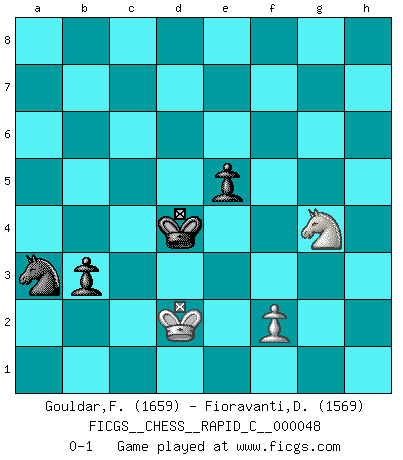 Last move : 0-1 2008 June 28 17:14:7 [Event "FICGS__CHESS__RAPID_C__000048"] [Site "FICGS"] [Date "2008.04.11"] [Round "1"] [White "Gouldar,Frances"] [Black "Fioravanti,Diego"] [Result "0-1"] [WhiteElo "1659"] [BlackElo "1569"] 1.d4 e6 2.e4 d5 3.Nc3 dxe4 4.Nxe4 Bd7 5.Nf3 Bc6 6.Bd3 Nd7 7.O-O Ngf6 8.Re1 Bxe4 9.Bxe4 Nxe4 10.Rxe4 Be7 11.Bf4 Nf6 12.Re2 c5 13.dxc5 Qxd1+ 14.Rxd1 Bxc5 15.Be3 Bxe3 16.Rxe3 Rc8 17.Red3 Ke7 18.c3 Rhd8 19.Rxd8 Rxd8 20.Rxd8 Kxd8 21.Kf1 Nd7 22.Ke2 e5 23.a4 Ke7 24.b4 f5 25.c4 b6 26.Kd2 Kd6 27.Kc3 h6 28.h3 g5 29.Nd2 h5 30.g4 hxg4 31.hxg4 fxg4 32.Ne4+ Ke6 33.Nxg5+ Kf5 34.Nf7 Ke4 35.Kd2 Kd4 36.Nd6 Nb8 37.b5 Nd7 38.Nc8 Kxc4 39.Nxa7 Nc5 40.Nc6 Kd5 41.a5 Nb3+ 42.Kc3 Nxa5 43.Ne7+ Ke4 44.Kd2 Nc4+ 45.Ke2 Nd6 46.Ke1 Kd4 47.Nc6+ Kd5 48.Kf1 Nxb5 49.Ne7+ Kc5 50.Ng8 Kd4 51.Nh6 Na3 52.Ke2 b5 53.Nxg4 b4 54.Kd2 b3 0-1 Queen's pawn Kingside Castling by player White (move 7) 10 pieces endgame at move 39 : White KNPPP , Black KNPPP WHITE : King + 1 Knight 3 Pawns BLACK : King + 1 Knight 3 Pawns 9 pieces endgame at move 42 : White KNPP , Black KNPPP WHITE : King + 1 Knight 2 Pawns BLACK : King + 1 Knight 3 Pawns 8 pieces endgame at move 48 : White KNP , Black KNPPP WHITE : King + 1 Knight 1 Pawn BLACK : King + 1 Knight 3 Pawns 7 pieces endgame at move 53 : White KNP , Black KNPP WHITE : King + 1 Knight 1 Pawn BLACK : King + 1 Knight 2 Pawns Player Black won this chess game. Follow this game move after move (download)Chess is in its essence a game, in its form an art, and in its execution a science. (Baron Tassilo) Schach ist Kampf, hauptsächlich jedoch gegen die eigenen Fehler. (Savielly Grigorievitsch Tartakower) Yo jugué Ajedrez con el y a veces le pude haber ganado solo que siempre devuelve su última jugada y juega la partida de manera diferente. (Mark Twain) Vouloir jouer aux échecs contre soi-même est aussi paradoxal que vouloir marcher sur son ombre. (Stefan Zweig) Indecision is the key to flexibility. (Unknown)