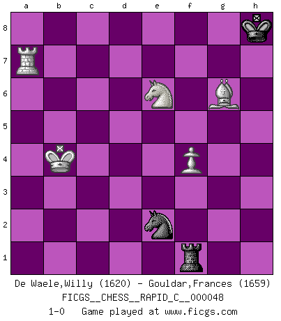 Last move : 1-0 2008 May 10 12:19:6 [Event "FICGS__CHESS__RAPID_C__000048"] [Site "FICGS"] [Date "2008.04.11"] [Round "1"] [White "De Waele,Willy"] [Black "Gouldar,Frances"] [Result "1-0"] [WhiteElo "1620"] [BlackElo "1659"] 1.e4 e6 2.d4 d5 3.Nc3 dxe4 4.Nxe4 Nd7 5.Nf3 Ngf6 6.Bg5 Be7 7.Nxf6+ Bxf6 8.h4 h6 9.Bxf6 Nxf6 10.Qd2 O-O 11.Bd3 b6 12.O-O-O Bb7 13.Ne5 c5 14.dxc5 Qc7 15.Qe3 Qxc5 16.Qxc5 bxc5 17.f3 Rfd8 18.Bb5 a6 19.Bd7 Bd5 20.Ba4 c4 21.Rd4 c3 22.bxc3 Bxa2 23.Kb2 Bd5 24.Ka3 Rac8 25.c4 Bb7 26.Rxd8+ Rxd8 27.Rb1 Ba8 28.Rb6 Nh5 29.c5 Nf4 30.g3 Ne2 31.c6 Rc8 32.c7 Rxc7 33.Rb8+ Kh7 34.Rxa8 Nxg3 35.Be8 g5 36.hxg5 hxg5 37.Nxf7 Rxc2 38.Nxg5+ Kh6 39.f4 Rf2 40.Nxe6 Ne2 41.Rxa6 Kh7 42.Ra4 Rf3+ 43.Kb4 Rf1 44.Ra7+ Kh8 45.Bg6 1-0 French : Rubinstein variation Kingside Castling by player Black (move 10) Queenside Castling by player White (move 12) 10 pieces endgame at move 38 : White KRBNP , Black KRNPP WHITE : King + 1 Rook 1 Bishop 1 Knight 1 Pawn BLACK : King + 1 Rook 1 Knight 2 Pawns 9 pieces endgame at move 40 : White KRBNP , Black KRNP WHITE : King + 1 Rook 1 Bishop 1 Knight 1 Pawn BLACK : King + 1 Rook 1 Knight 1 Pawn 8 pieces endgame at move 41 : White KRBNP , Black KRN WHITE : King + 1 Rook 1 Bishop 1 Knight 1 Pawn BLACK : King + 1 Rook 1 Knight Player White won this chess game. Follow this game move after move (download)Examine moves that smite! A good eye for smites is far more important than a knowledge of strategical principles. (Purdy) Privat ist Kortschnoi kein schlechter Mensch, sehr sympathisch. Aber während des Spiels ist er grausam. Er will dich töten. (Miguel Najdorf) Una compensación adecuada por un sacrificio es tener una combinación sólida que conduce a una posición ganadora; una compensación adecuada por una metida de pata es dejar a tu oponente arrebatar una derrota de las fauces de la victoria. (Bruce A. Moon) La tactique, c'est ce que vous faites quand il y a quelque chose à faire; la stratégie, c'est ce que vous faites quand il n'y a rien à faire. (Savielli Tartacower) Memory is a crazy woman that hoards colored rags and throws away food. (Austin O'Malley)