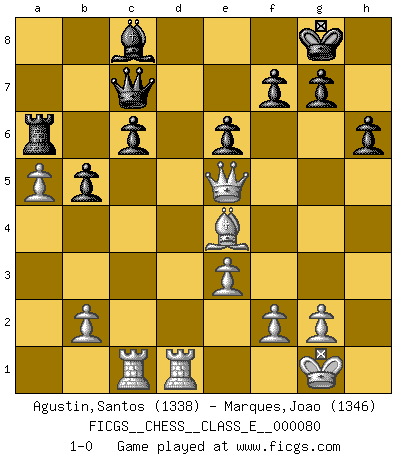 Last move : 1-0 2008 May 21 12:14:38 [Event "FICGS__CHESS__CLASS_E__000080"] [Site "FICGS"] [Date "2008.04.11"] [Round "1"] [White "Agustin,Santos"] [Black "Marques,Joao"] [Result "1-0"] [WhiteElo "1338"] [BlackElo "1346"] 1.d4 d5 2.c4 Nf6 3.Nf3 e6 4.Nc3 Be7 5.Bg5 O-O 6.e3 c6 7.Be2 Nbd7 8.O-O dxc4 9.Bxc4 b5 10.Bd3 Bb7 11.Rc1 a6 12.a4 h6 13.Bh4 Nb6 14.Qb3 Ng4 15.Bxe7 Qxe7 16.a5 Nd5 17.Ne4 Qc7 18.Nc5 Ndf6 19.h3 Bc8 20.hxg4 Nxg4 21.Qc3 Ra7 22.Ne5 Nxe5 23.dxe5 Rd8 24.Rfd1 Rd5 25.Be4 Rxe5 26.Nxa6 Rxa6 27.Qxe5 1-0 QGD : Marshall defense Kingside Castling by player Black (move 5) Kingside Castling by player White (move 8) Player White won this chess game. Follow this game move after move (download)Chess is a terrible game. If you have no center, your opponent has a freer position. If you do have a center, then you really have something to worry about ! (Siegbert Tarrasch) Wie kann ich Remis annehmen? Ich weiß ja gar nicht, wie ich stehe! (Fritz Sämisch) Haz el enroque temprano y seguido. (Rob Sillars) A ce moment-là, je menaçais de comprendre la position ! (Clément L'Heureux) Happy endings are just stories that haven't finished yet. (Jane Smith in Mr & Mrs Smith)