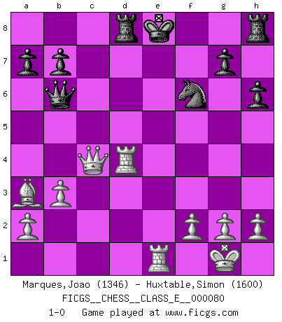 Last move : 1-0 2008 April 17 20:44:5 [Event "FICGS__CHESS__CLASS_E__000080"] [Site "FICGS"] [Date "2008.04.11"] [Round "1"] [White "Marques,Joao"] [Black "Huxtable,Simon"] [Result "1-0"] [WhiteElo "1346"] [BlackElo "1600"] 1.e4 c6 2.d4 d5 3.Nc3 dxe4 4.Nxe4 Bf5 5.Ng3 Bg6 6.Nf3 h6 7.Bc4 Nf6 8.Ne5 c5 9.Bb5+ Nbd7 10.Bxd7+ Nxd7 11.Nxg6 fxg6 12.Qg4 Nf6 13.Qxg6+ Kd7 14.O-O cxd4 15.c3 Qb6 16.Rd1 e5 17.cxd4 exd4 18.Qf7+ Kc6 19.Qc4+ Bc5 20.Nf5 Kd7 21.Nxd4 Bxd4 22.Rxd4+ Ke7 23.b3 Rad8 24.Ba3+ Ke8 25.Re1+ 1-0 Caro-Kann : Classical variation Kingside Castling by player White (move 14) Player White won this chess game. Follow this game move after move (download)The stomach is an essential part of the Chess master. (Bent Larsen) Der 70jährige Viktor Kortschnoi: Die Rentenanstalt wollte mich zwingen in Rente zu gehen. Meine Frau erhält jetzt eine Pension- und ich zahle weiter in die Rentenkasse ein! (Viktor Kortschnoi) No es suficiente ser un buen jugador, se debe también de jugar bién. (Siegbert Tarrasch) Les écrivains ont utilisé les échecs pour analyser les côtés extrêmes de la nature humaine. Dans ce cadre, les échecs offrent un champ d'expérimentation idéal. Mais on pourrait faire la même chose avec la peinture. Et là, en vous référant à Van Gogh, vous ne tirerez pas de conclusion définitive sur les peintres. (Gary Kasparov) Horse racing is animated roulette. (Roger Kahn)