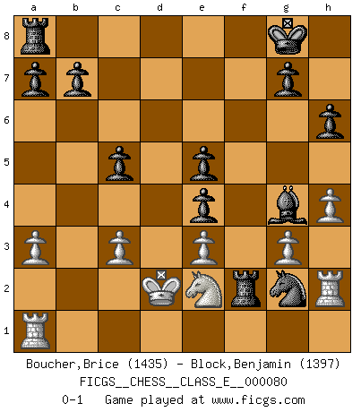 Last move : 0-1 2008 June 24 11:17:20 [Event "FICGS__CHESS__CLASS_E__000080"] [Site "FICGS"] [Date "2008.04.11"] [Round "1"] [White "Boucher,Brice"] [Black "Block,Benjamin"] [Result "0-1"] [WhiteElo "1435"] [BlackElo "1397"] 1.c4 Nf6 2.Nc3 e5 3.g3 Bb4 4.Bg2 O-O 5.a3 Bxc3 6.bxc3 Nc6 7.d3 e4 8.dxe4 Qe7 9.Qd3 Ne5 10.Qd4 c5 11.Qd1 Nxc4 12.Bg5 h6 13.Bxf6 Qxf6 14.Qb3 Qe6 15.Nh3 Ne3 16.Qxe6 Nxg2+ 17.Kd2 dxe6 18.e3 e5 19.Ng1 f5 20.h4 fxe4 21.Rh2 Rxf2+ 22.Ne2 Bg4 0-1 English Opening Kingside Castling by player Black (move 4) Player Black won this chess game. Follow this game move after move (download)A good sacrifice is one that is not necessarily sound but leaves your opponent dazed and confused. (Rudolph Spielmann) Wir irren allesamt, nur jeder irrt anders. (Georg Christoph Lichtenberg) El Ajedrez es el arte del análisis. (Mikhail Botvinnik) La guerre est enfant de la passion, la passion est enfant du narcissisme et le narcissisme est l'enfant. (...) Une autre partie ? (Thibault de Vassal) Once you start thinking you have nothing left to learn, you have everything to learn. (Steve Badget)