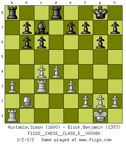 Last move : 1/2-1/2 2008 April 17 18:28:24 [Event "FICGS__CHESS__CLASS_E__000080"] [Site "FICGS"] [Date "2008.04.11"] [Round "1"] [White "Huxtable,Simon"] [Black "Block,Benjamin"] [Result "1/2-1/2"] [WhiteElo "1600"] [BlackElo "1397"] 1.d4 Nf6 2.c4 g6 3.Nf3 Bg7 4.Nc3 d5 5.e3 O-O 6.Bd3 c6 7.O-O Bg4 8.Re1 Na6 9.a3 dxc4 10.Bxc4 Nc7 11.Be2 Ncd5 12.Ne5 Bxe2 13.Rxe2 Nxc3 14.bxc3 Nd5 15.Qb3 Qb6 16.Qxb6 axb6 17.c4 Nc3 18.Rc2 Bxe5 19.Rxc3 Rfd8 20.Bb2 Bc7 1/2-1/2 King's Indian, 3.Nf3 Kingside Castling by player Black (move 5) Kingside Castling by player White (move 7) This chess game ended in a draw. Follow this game move after move (download)Via the squares on the chessboard, the Indians explain the movement of time and the age, the higher influences which control the world and the ties which link Chess with the human soul. (Al-Masudi) Der Knackpunkt bei der Konzentration ist, daß wir nur durch sie etwas Neues und Ungewöhnliches am Schachbrett finden können. Sie ist der einzige Weg durch neue neue Ideen eine Überraschung zu bereiten. (Garry Kasparov) La estratégia requiere pensar, la táctica requiere observación. (Max Euwe) Le profane ne songe pas à la somme de jouissance dont il se prive, qui méconnaît ce jeu aux ressources aussi variées que passionnantes. (Jean-Marie Jeanton-Lamarche) A belief is an idea the mind possesses, an idea that possesses the mind. (Robert Oxden Bolton)