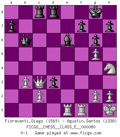 Last move : 0-1 2008 September 11 18:23:20 [Event "FICGS__CHESS__CLASS_E__000080"] [Site "FICGS"] [Date "2008.04.11"] [Round "1"] [White "Fioravanti,Diego"] [Black "Agustin,Santos"] [Result "0-1"] [WhiteElo "1569"] [BlackElo "1338"] 1.b3 Nf6 2.Bb2 d5 3.f4 Nc6 4.Nf3 g6 5.e3 Bg7 6.Bb5 O-O 7.O-O Bf5 8.Bxc6 bxc6 9.d3 c5 10.Nbd2 Qd6 11.Qe1 Bc8 12.Qh4 Rd8 13.Rae1 Qb6 14.e4 c4 15.Bd4 c5 16.Bxf6 Bxf6 17.Ng5 Bxg5 18.fxg5 c3 19.Nf3 c4 20.d4 cxb3 21.axb3 dxe4 22.Qxe4 Bf5 23.Qe2 e5 24.Kh1 exd4 25.Nh4 d3 26.Qe5 Be6 27.Qxc3 Rac8 0-1 Nimzovich-Larsen attack : Indian variation Kingside Castling by player Black (move 6) Kingside Castling by player White (move 7) Player Black won this chess game. Follow this game move after move (download)It is the aim of the modern school, not to treat every position according to one general law, but according to the principle inherent in the position. (Richard Reti) Alles was ich jemals tun will ist Schach spielen. (Robert James Fischer) No es tiempo de jugar al Ajedrez cuando la casa esta en llamas. (Proverbio Italiano) Un footballeur joue avec ses pieds, parfois avec sa tête. Un joueur d'échecs ne joue qu'avec sa tête. Et quand il ne joue plus, il meurt. (Jacob Murray) When you stop learning you start dying. (Scott Adams)