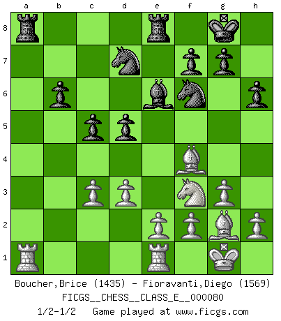Last move : 1/2-1/2 2008 September 8 22:43:56 [Event "FICGS__CHESS__CLASS_E__000080"] [Site "FICGS"] [Date "2008.04.11"] [Round "1"] [White "Boucher,Brice"] [Black "Fioravanti,Diego"] [Result "1/2-1/2"] [WhiteElo "1435"] [BlackElo "1569"] 1.c4 e6 2.Nc3 Bb4 3.g3 Nf6 4.Bg2 O-O 5.a3 Bxc3 6.bxc3 d5 7.Qb3 Nbd7 8.Nf3 c6 9.O-O Qb6 10.Qxb6 Nxb6 11.cxd5 exd5 12.d3 Re8 13.Re1 Bf5 14.Bf4 c5 15.a4 Nbd7 16.a5 b5 17.axb6 axb6 18.Nh4 Be6 19.Nf3 h6 1/2-1/2 English Opening Kingside Castling by player Black (move 4) Kingside Castling by player White (move 9) This chess game ended in a draw. Follow this game move after move (download)Fischer is the strongest player in the world. In fact, the strongest player who ever lived. (Larry Evans) Schach ist Leben. (Robert James Fischer) Bobby solo arroja las piezas y solas caen en las casillas correctas. (Miguel Najdorf ) Vouloir jouer aux échecs contre soi-même est aussi paradoxal que vouloir marcher sur son ombre. (Stefan Zweig) SEO proverb : Make your website optimized for human beings, not for search engines.