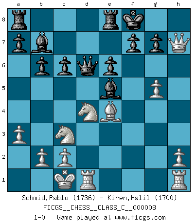 Last move : 1-0 2007 January 18 6:35:21 [Event "FICGS__CHESS__CLASS_C__000008"] [Site "FICGS"] [Date "2006.07.14"] [Round "1"] [White "Schmid,Pablo"] [Black "Kiren,Halil"] [Result "1-0"] [WhiteElo "1736"] [BlackElo "1700"] 1.d4 Nf6 2.f3 d5 3.e4 dxe4 4.Nc3 exf3 5.Nxf3 e6 6.Bg5 Be7 7.Bd3 Nc6 8.a3 O-O 9.Qd2 b6 10.Qf4 Re8 11.Bxf6 Bxf6 12.Qe4 Bb7 13.Qxh7+ Kf8 14.O-O-O Nxd4 15.Be4 c6 16.g4 Qd6 17.g5 Be5 18.Nxd4 1-0 This chess game has been lost on time (started : 2006.07.14 7:38:57) Blackmar-Diemer gambit Kingside Castling by player Black (move 8) Queenside Castling by player White (move 14) Player White won this chess game. Follow this game move after move (download)It began to feel as though you were playing against Chess itself. - On playing against Robert Fischer. (Walter Shipman) Es tut gut, die Entwicklungsperiode von, [...] demokratischem Geist durchdringen zu lassen. Wie undemokratisch wäre es doch beispielsweise, den einen Offizier große Spaziertouren vornehmen zu lassen, während die anderen zu Hause säßen und sich entsetzlich langweilten. (Aaron Nimzowitsch) Debes de llevar a tu oponente hacia un profundo y obscuro bosque donde 2+2=5, y el camino que conduce a la salida es suficientemente ancho para solamente uno. (Mikhail Tal) Des idées, des idées, j'en ai cent, j'en ai mille. Des bonnes, des mauvaises, applicables, irréalisables... Il suffit de faire le tri ! (Roos) Programming can only do so much before it becomes too much. (Don Groves)