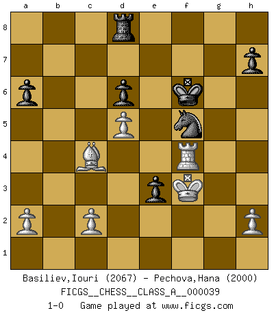 Last move : 1-0 2008 November 23 9:47:57 [Event "FICGS__CHESS__CLASS_A__000039"] [Site "FICGS"] [Date "2008.04.13"] [Round "1"] [White "Basiliev,Iouri"] [Black "Pechova,Hana"] [Result "1-0"] [WhiteElo "2067"] [BlackElo "2000"] 1.e4 c5 2.Nf3 Nc6 3.d4 cxd4 4.Nxd4 Nf6 5.Nc3 e5 6.Ndb5 d6 7.Bg5 a6 8.Na3 b5 9.Bxf6 gxf6 10.Nd5 f5 11.Bd3 Be6 12.O-O Bxd5 13.exd5 Ne7 14.Nxb5 Bg7 15.Nc3 e4 16.Bc4 Qa5 17.Qd2 Rc8 18.Bb3 Bxc3 19.bxc3 Qxc3 20.Qh6 Qe5 21.f3 Rg8 22.fxe4 fxe4 23.Qf6 Qxf6 24.Rxf6 Rg6 25.Raf1 Rxf6 26.Rxf6 Rd8 27.Rf4 f5 28.g4 Kf7 29.gxf5 e3 30.Kg2 Kf6 31.Kf3 Nxf5 32.Bc4 1-0 This chess game has been lost on time (started : 2008.04.13 20:45:9) Sicilian : Pelikan (Lasker/Sveshnikov) variation Kingside Castling by player White (move 12) Player White won this chess game. Follow this game move after move (download)When you don't know what to do, wait for your opponent to get an idea - it's sure to be wrong. (Tarrasch) Wenn ich mich einlogge, glauben die Leute gewöhnlich nicht, dass ich es selbst bin und sie fangen an, mir dumme Fragen zu stellen. Und wenn sie es glauben, stellen sie wieder andere dumme Fragen. (Judith Polgar) Si no le temes a Spassky, entonces elimino el elemento del dinero. (Jim Slater) La victoire dans une partie d'Echecs appartient la plupart du temps à celui qui voit un peu plus loin que l'adversaire. (Lasker) Luck is when opportunity knocks and you answer. (Anonymous)