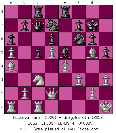 Last move : 0-1 2008 October 22 12:32:40 [Event "FICGS__CHESS__CLASS_A__000039"] [Site "FICGS"] [Date "2008.04.13"] [Round "1"] [White "Pechova,Hana"] [Black "Gray,Garvin"] [Result "0-1"] [WhiteElo "2000"] [BlackElo "2052"] 1.d4 Nf6 2.c4 c5 3.d5 e6 4.Nc3 exd5 5.cxd5 d6 6.e4 g6 7.Nf3 Bg7 8.Be2 O-O 9.O-O a6 10.a4 Bg4 11.Bf4 Bxf3 12.Bxf3 Qe7 13.Re1 Nbd7 14.a5 h5 15.h3 Nh7 16.Qd2 Bd4 17.Bd1 Nhf6 18.Bc2 Rfe8 19.Bg5 Rac8 20.Kh1 Qd8 21.Ba4 Qc7 22.f3 Kg7 23.Rec1 Be5 0-1 This chess game has been lost on time (started : 2008.04.13 20:45:9) Benoni : Classical with e4 and Nf3 Kingside Castling by player Black (move 8) Kingside Castling by player White (move 9) Player Black won this chess game. Follow this game move after move (download)I won't play with you anymore. You have insulted my friend. - When an opponent cursed himself for a blunder. (Miguel Najdorf) Schach ist ein Teil der Kultur, und wenn es mit der Kultur abwärts geht, geht es auch mit dem Schach abwärts. (Mikhail Moiseyevich Botvinik) El Ajedrez moderno está demasiado preocupado con cosas como la estructura de Peones. Olvidenlo, el Jaque Mate termina la partida. (Nigel Short) Que feriez-vous si vous étiez en train de jouer aux échecs et que la fin du monde arrive ? Je continuerais à jouer. (Saint Borromée) He who laughs last probably does not get the joke. (Unknown)