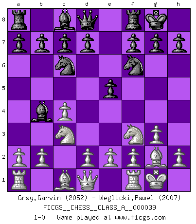 Last move : 1-0 2008 June 8 11:54:23 [Event "FICGS__CHESS__CLASS_A__000039"] [Site "FICGS"] [Date "2008.04.13"] [Round "1"] [White "Gray,Garvin"] [Black "Weglicki,Pawel"] [Result "1-0"] [WhiteElo "2052"] [BlackElo "2007"] 1.c4 Nf6 2.Nc3 e5 3.g3 Bb4 4.Bg2 O-O 5.Nf3 Nc6 6.O-O 1-0 This chess game has been lost on time (started : 2008.04.13 20:45:9) English Opening Kingside Castling by player Black (move 4) Kingside Castling by player White (move 6) Player White won this chess game. Follow this game move after move (download)Chess is a terrific way for kids to build self image and self esteem. (Saudin Robovic) Das Blackmar-Diemer-Gambit verändert den ganzen Menschen! (Emil Joseph Diemer) Cualquier cambio de material en una posición debe venir por medio de un mate, una captura o promoción de Peón. (Purdy) Demandez au pauvre Cg1 ce qu'il en pense. Eduard Gufeld à propos de la variante Saemisch de l'Est-Indienne. Life is like a ten-speed bicycle: most of us have gears we never use. (Charles M. Schulz)