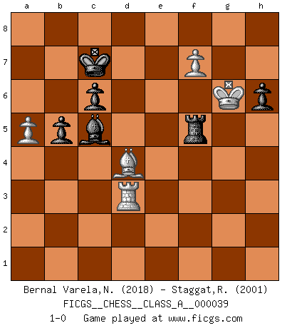 Last move : 1-0 2009 April 29 16:48:18 [Event "FICGS__CHESS__CLASS_A__000039"] [Site "FICGS"] [Date "2008.04.13"] [Round "1"] [White "Bernal Varela,Nelson"] [Black "Staggat,Rolf"] [Result "1-0"] [WhiteElo "2018"] [BlackElo "2001"] 1.e4 e5 2.Nf3 Nc6 3.Bb5 Nf6 4.O-O Nxe4 5.d4 Nd6 6.Bxc6 dxc6 7.dxe5 Nf5 8.Qxd8+ Kxd8 9.Nc3 Bd7 10.Ne4 b6 11.Rd1 Kc8 12.a4 h6 13.a5 Be6 14.axb6 cxb6 15.h3 Be7 16.g4 Bd5 17.Re1 Nh4 18.Nxh4 Bxe4 19.Rxe4 Bxh4 20.Bd2 Re8 21.Bc3 Re7 22.f4 Kc7 23.b4 Kb7 24.Kg2 Rd8 25.Kf3 Red7 26.Rf1 Re8 27.Rg1 Bd8 28.f5 Bh4 29.Rb1 Red8 30.Ra1 Re7 31.Rd4 Rxd4 32.Bxd4 Rd7 33.c3 Re7 34.c4 a6 35.c5 b5 36.Bc3 Re8 37.Rd1 Kc7 38.e6 fxe6 39.Bxg7 exf5 40.gxf5 Re1 41.Rd4 Bg5 42.Kg4 a5 43.h4 Bc1 44.f6 Rf1 45.bxa5 Be3 46.Rd3 Bxc5 47.Kh5 Rf4 48.Kg6 Rxh4 49.f7 Rg4+ 50.Kh7 Rg5 51.Bd4 Rf5 52.Kg6 1-0 Ruy Lopez : Berlin defense, Open variation Kingside Castling by player White (move 4) Player White won this chess game. Follow this game move after move (download)Checkers is for tramps. (Paul Morphy) Capablanka war das größte Genie der Schachgeschichte! Aber denken sie nicht er habe nichts vom Schach verstanden. Er wusste nur soviel wie er wissen musste um seine Ziele zu erreichen. (Mikhail Moiseyevich Botvinik) Tu cuerpo tiene que estar en óptima condición. Tu Ajedrez se deteriora como lo hace tu cuerpo. No puedes separar la mente y el cuerpo. (Bobby Fischer) Le système Elo représente seulement une moyenne. Il est simplement un indicateur de votre stabilité. (Anatoli Karpov) I can't decide which is riskier; taking crazy risks, or taking advice on crazy risks from a crazy risk taker. (Gregory House in House M.D.)