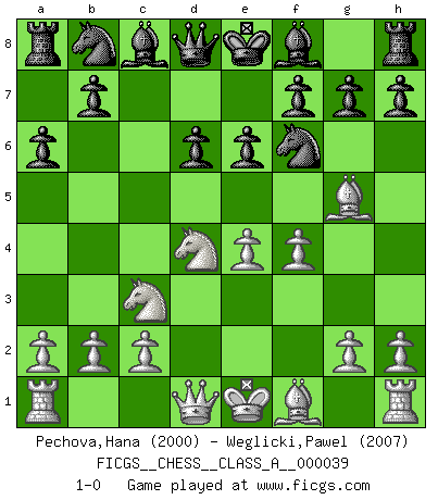 Last move : 1-0 2008 June 2 23:25:11 [Event "FICGS__CHESS__CLASS_A__000039"] [Site "FICGS"] [Date "2008.04.13"] [Round "1"] [White "Pechova,Hana"] [Black "Weglicki,Pawel"] [Result "1-0"] [WhiteElo "2000"] [BlackElo "2007"] 1.e4 c5 2.Nf3 d6 3.d4 cxd4 4.Nxd4 Nf6 5.Nc3 a6 6.Bg5 e6 7.f4 1-0 This chess game has been lost on time (started : 2008.04.13 20:45:9) Sicilian : Najdorf, 7.f4 Player White won this chess game. Follow this game move after move (download)You have to have the fighting spirit. You have to force moves and take chances. (Bobby Fischer) Kleine Schachspieler machen Mist, und große Schachspieler machen Mist, aber große machen weniger Mist. (Fritz Sämisch) No hay un Gran Maestro de Ajedrez que sea normal; solo se diferencían ellos por la magnitud de su locura. (Viktor Korchnoi) Il vaut toujours mieux jouer un plan faux de façon logique que de n'avoir pas de plan du tout. (Victor Kortchnoï) The mind is like a parachute, it only functions when its open. (Unknown)