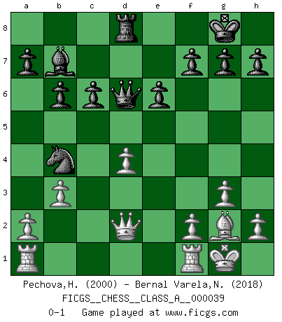 Last move : 0-1 2008 November 24 21:55:5 [Event "FICGS__CHESS__CLASS_A__000039"] [Site "FICGS"] [Date "2008.04.13"] [Round "1"] [White "Pechova,Hana"] [Black "Bernal Varela,Nelson"] [Result "0-1"] [WhiteElo "2000"] [BlackElo "2018"] 1.d4 Nf6 2.c4 e6 3.Nf3 b6 4.g3 Bb4+ 5.Bd2 Bxd2+ 6.Qxd2 Ba6 7.b3 c6 8.Nc3 d5 9.e4 Nxe4 10.Nxe4 dxe4 11.Ng5 Qe7 12.Nxe4 O-O 13.Bg2 Bb7 14.O-O Rd8 15.Qe3 Na6 16.c5 Rd7 17.Nd6 Rad8 18.Qe2 Nb4 19.Qd2 Rxd6 20.cxd6 Qxd6 0-1 This chess game has been lost on time (started : 2008.04.13 20:45:9) Queen's Indian : 4.g3 Kingside Castling by player Black (move 12) Kingside Castling by player White (move 14) Player Black won this chess game. Follow this game move after move (download)Fischer, who may or may not be mad as a hatter, has every right to be horrified. (Jeremy Silman) Ich liebe den Moment, wenn ich das Ego meines Gegenüber breche. (Robert James Fischer) Fischer sacrificó virtualmente todo lo que la mayoría de nosotros los 'debiles' (término que él usa) valoramos, respetamos y apreciamos por el amor de un astuto, a menudo hermoso tablero de juego, por el privilegio ambivalente de ser su mas grande maestro. (Paul Kollar) Les échecs, c'est l'imagination. (David Bronstein) If we knew what we were doing, we would not call it research. (Albert Einstein)