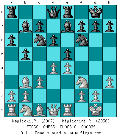 Last move : 0-1 2008 June 27 13:28:31 [Event "FICGS__CHESS__CLASS_A__000039"] [Site "FICGS"] [Date "2008.04.13"] [Round "1"] [White "Weglicki,Pawel"] [Black "Migliorini,Roberto"] [Result "0-1"] [WhiteElo "2007"] [BlackElo "2058"] 1.e4 e5 2.Nf3 Nc6 3.Bb5 a6 4.Ba4 Nf6 5.O-O Be7 6.Re1 b5 7.Bb3 d6 8.c3 O-O 9.h3 Bb7 10.d4 Re8 0-1 Ruy Lopez : Closed Kingside Castling by player White (move 5) Kingside Castling by player Black (move 8) Player Black won this chess game. Follow this game move after move (download)Chess is as much a mystery as women. (Purdy) Modernes Schach erfordert enorme Anspannung. Es ist für einen normalen Menschen unmöglich das auszuhalten. (Viktor Kortschnoi) No volvere nunca a jugar contigo. Has insultado a mi amigo. - cuando un oponente se maldijo por una mala jugada (Miguel Najdorf) À la honte des hommes, on sait que les lois du jeu sont les seules qui soient partout justes, claires, inviolables et exécutées. Pourquoi l'Indien qui a donné les règles du jeu d'échecs est-il obéi de bon gré dans toute la terre, et que les décrétales des papes, par exemple, sont aujourd'hui un objet d'horreur et de mépris ? C'est que l'inventeur des échecs combina tout avec justesse pour la satisfaction des joueurs, et que les papes, dans leurs décrétales, n'eurent en vue que leur seul avantage. L'Indien voulut exercer également l'esprit des hommes et leur donner du plaisir; les papes ont voulu abrutir l'esprit des hommes. Voltaire (Dictionnaire philosophique / Garnier 1967) The modern world has divided itself into Conservatives and Progressives. The business of Progressives is to go on making mistakes. The business of the Conservatives is to prevent the mistakes from being corrected. (G.K. Chesterton)