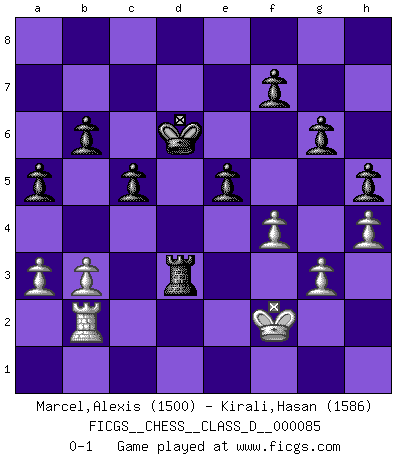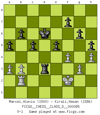 Last move : 0-1 2008 August 10 17:5:41 [Event "FICGS__CHESS__CLASS_D__000085"] [Site "FICGS"] [Date "2008.04.14"] [Round "1"] [White "Marcel,Alexis"] [Black "Kirali,Hasan"] [Result "0-1"] [WhiteElo "1500"] [BlackElo "1586"] 1.f4 d5 2.Nf3 e6 3.e3 Nc6 4.b3 Nf6 5.Bb2 Bc5 6.Be2 O-O 7.O-O Ne4 8.Nc3 Nxc3 9.Bxc3 d4 10.exd4 Nxd4 11.Nxd4 Bxd4+ 12.Bxd4 Qxd4+ 13.Kh1 b6 14.Bf3 Ba6 15.c3 Qd6 16.Bxa8 Bxf1 17.Qxf1 Rxa8 18.Rd1 Qa3 19.Qf3 Rf8 20.Ra1 Qb2 21.Qd1 Rd8 22.d4 Qxc3 23.Rc1 Qxd4 24.Qxd4 Rxd4 25.g3 c5 26.Rc2 a5 27.Kg2 Kf8 28.Kf3 Ke7 29.h4 Rd3+ 30.Kg2 h5 31.Kf2 Kd6 32.Rb2 g6 33.a3 e5 0-1 Bird's Opening Kingside Castling by player Black (move 6) Kingside Castling by player White (move 7) Player Black won this chess game. Follow this game move after move (download)Not all artists are Chess players, but all Chess players are artists. (Marcel Duchamp) Ich rechne überhaupt nicht voraus. Ich gewinne auch so. (Robert James Fischer) El Ajedrez es un terrible juego. Si no controlas el centro, tu oponente tiene una posición mas holgada. Si tienes control del centro, ¡entonces realmente tu tienes algo de que preocuparte!. (Siegbert Tarrasch) Aidez vos pièces, elles vous aideront. (Paul Morphy) Sometimes it pays to stay in bed in Monday, rather than spending the rest of the week debugging Monday's code. (Dan Salomon)