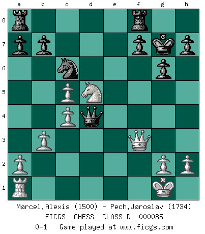 Last move : 0-1 2008 August 16 0:13:42 [Event "FICGS__CHESS__CLASS_D__000085"] [Site "FICGS"] [Date "2008.04.14"] [Round "1"] [White "Marcel,Alexis"] [Black "Pech,Jaroslav"] [Result "0-1"] [WhiteElo "1500"] [BlackElo "1734"] 1.f4 d5 2.Nf3 Nf6 3.e3 g6 4.Be2 Bg7 5.O-O O-O 6.b3 c5 7.Bb2 Nc6 8.Nc3 d4 9.Nb1 Bf5 10.exd4 Nh5 11.c3 Nxf4 12.dxc5 Nxe2+ 13.Qxe2 Bd3 14.Qf2 Bxf1 15.Qxf1 e5 16.c4 e4 17.Bxg7 Kxg7 18.Nc3 exf3 19.Qxf3 Qxd2 20.Nd5 Qd4+ 0-1 Bird's Opening Kingside Castling by player White (move 5) Kingside Castling by player Black (move 5) Player Black won this chess game. Follow this game move after move (download)All Chess players should have a hobby. (Savielly Tartakower) Wie bekannt hörte Morphy 1859 auf, Schach zu spielen. Seine Enttäuschung galt nicht so sehr dem Schach, wie den Schachspielern. (Robert James Fischer) El Ajedrez no es como la vida... ¡tiene reglas!. (Mark Pasternak) La conception d'un plan est le processus par lequel un joueur exploite les avantages de sa position tout en s'efforçant d'en réduire au minimum les inconvénients. Afin de garantir le succès, un plan doit toujours se fonder sur un diagnostic objectif des particularités d'une position. La conception d'un plan est d'autant plus difficile que la position est équilibrée, et grandement facilitée lorsqu'il n'existe qu'un seul plan susceptible de répondre aux exigences de la position. (Harry Golombek) I don't diet. I just don't eat as much as I'd like to. (Linda Evangelista, supermodel)
