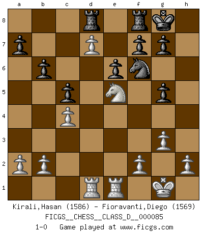 Last move : 1-0 2008 September 11 18:23:56 [Event "FICGS__CHESS__CLASS_D__000085"] [Site "FICGS"] [Date "2008.04.14"] [Round "1"] [White "Kirali,Hasan"] [Black "Fioravanti,Diego"] [Result "1-0"] [WhiteElo "1586"] [BlackElo "1569"] 1.e4 b6 2.Nf3 Bb7 3.Nc3 e6 4.d4 Nf6 5.Bd3 d5 6.exd5 Nxd5 7.Nxd5 Bxd5 8.O-O Bd6 9.c4 Bb7 10.Qe2 Nd7 11.Bg5 Be7 12.Bf4 O-O 13.Be4 Bxe4 14.Qxe4 Bd6 15.Bg5 Nf6 16.Qd3 h6 17.Bh4 c5 18.Rad1 Be7 19.Rfe1 Qc7 20.d5 Rad8 21.Qe2 Nh5 22.Bxe7 Qxe7 23.Ne5 Nf4 24.Qg4 Qg5 25.Qxg5 hxg5 26.g3 Nh5 27.d6 Nf6 28.d7 1-0 Owen defense Kingside Castling by player White (move 8) Kingside Castling by player Black (move 12) Player White won this chess game. Follow this game move after move (download)When I have White, I win because I am white; When I have Black, I win because I am Bogolyubov. (Bogolyubov) Die Auseinandersetzung mit Karpow war politisch geprägt. Er stand für das kommunistische System, wurde von dessen Repräsentanten gehätschelt. Ich war der Oppositionelle. Jeder Schachweltmeister spiegelt auch die gesellschaftlichen Verhältnisse wider. Kramnik steht für die Börsen-Generation des Neuen Markts, ideologiefrei, zahlenfixiert. (Garry Kasparov) Yo he agregado estos principios a la ley: pongan los Caballos en acción antes de que los dos Alfiles sean desarrollados. (Emanuel Lasker) Il a essayé de se convaincre qu'il pourrait empêcher toutes les erreurs et ne jamais perdre. L'horreur ! Gary Kasparov au sujet de Robert Fischer. There are two types of people in this world, good and bad. The good sleep better, but the bad seem to enjoy the waking hours much more. (Woody Allen)
