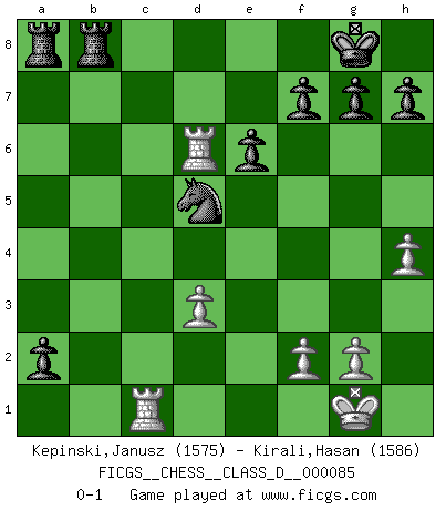 Last move : 0-1 2008 July 13 12:26:7 [Event "FICGS__CHESS__CLASS_D__000085"] [Site "FICGS"] [Date "2008.04.14"] [Round "1"] [White "Kepinski,Janusz"] [Black "Kirali,Hasan"] [Result "0-1"] [WhiteElo "1575"] [BlackElo "1586"] 1.e4 Nc6 2.a3 Nf6 3.d3 d5 4.Nc3 dxe4 5.Be3 Bg4 6.Be2 Bxe2 7.Ngxe2 exd3 8.cxd3 e6 9.O-O Be7 10.Qb3 Rb8 11.Nb5 a6 12.Na7 Ne5 13.Bf4 Ng6 14.Rac1 Nxf4 15.Nxf4 O-O 16.Ne2 Qd5 17.Qxd5 Nxd5 18.Nc3 Bd6 19.Ne4 Ra8 20.Nxd6 cxd6 21.Nc6 bxc6 22.Rxc6 Rfb8 23.b4 a5 24.Rxd6 axb4 25.Rc1 bxa3 26.h4 a2 0-1 KP : Nimzovich defense Kingside Castling by player White (move 9) Kingside Castling by player Black (move 15) Player Black won this chess game. Follow this game move after move (download)The tactician knows what to do when there is something to do; whereas the strategian knows what to do when there is nothing to do. (Gerald Abrahams) Mit sehr nachdenklichem Gesicht schreitet Bobby durch den Turniersaal. Was ist passiert?, fragt Lombardy. Ich stehe schlecht, antwortet Fischer. Lombardy: Dann biete doch einfach Remis an. Fischer: So schlecht stehe ich nun auch wieder nicht! (Robert James Fischer) La táctica fluye a partir de una posición superior. (Bobby Fischer) Les Echecs ont trois composantes : le temps, l'espace et le matériel en dernier. (Mikhail Tal) Now be brave and don't look back. Don't look back. (Shmi Skywalker in Star Wars ep.1)