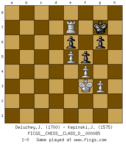 Last move : 1-0 2008 July 19 19:51:30 [Event "FICGS__CHESS__CLASS_D__000085"] [Site "FICGS"] [Date "2008.04.14"] [Round "1"] [White "Deluchey,Jean-Philippe"] [Black "Kepinski,Janusz"] [Result "1-0"] [WhiteElo "1700"] [BlackElo "1575"] 1.e4 e6 2.d4 d5 3.e5 b6 4.c3 Qd7 5.Nf3 c5 6.Be3 cxd4 7.Nxd4 Ba6 8.Bxa6 Nxa6 9.O-O g6 10.Nd2 Bg7 11.f4 Ne7 12.a4 O-O 13.a5 Rfe8 14.Qe2 Nc5 15.b4 Na4 16.Qb5 Qxb5 17.Nxb5 a6 18.Nc7 Nxc3 19.axb6 d4 20.Bxd4 Ne2+ 21.Kf2 Nxd4 22.b7 Rab8 23.Nxe8 Rxb7 24.Rxa6 Rb8 25.Nd6 Rxb4 26.Ra8+ Bf8 27.Rc1 Rb2 28.Ke1 Nc2+ 29.Ke2 Nd4+ 30.Kd3 Rxd2+ 31.Kxd2 Nb3+ 32.Kd1 Nxc1 33.Kxc1 Nd5 34.g3 h5 35.Kd2 Kg7 36.Ra7 Be7 37.Ke2 h4 38.Kf3 hxg3 39.hxg3 f6 40.Nc8 f5 41.Nxe7 Nxe7 42.Rxe7+ 1-0 French : Advance variation Kingside Castling by player White (move 9) Kingside Castling by player Black (move 12) 10 pieces endgame at move 41 : White KRPPP , Black KNPPP WHITE : King + 1 Rook 3 Pawns BLACK : King + 1 Knight 3 Pawns 9 pieces endgame at move 42 : White KRPPP , Black KPPP WHITE : King + 1 Rook 3 Pawns BLACK : King + 3 Pawns Player White won this chess game. Follow this game move after move (download)At this time Fischer is simply a level above all the best Chessplayers in the world. (John Jacobs) Kasparov ist eine Art Monster mit hundert Augen, denen auch nicht das Geringste entgeht. (Tony Miles) Vive, pierde y aprende al observar a tu oponente como gana. (Amber Steenbock) Le système Elo représente seulement une moyenne. Il est simplement un indicateur de votre stabilité. (Anatoli Karpov) Perhaps the current trend of many chess professionals taking up the more lucrative pastime of poker is not a wholly negative one. It may not be too late for humans to relearn how to take risks in order to innovate and thereby maintain the advanced lifestyles we enjoy. And if it takes a poker-playing supercomputer to remind us that we can't enjoy the rewards without taking the risks, so be it. (The Chess Master and the Computer, by Garry Kasparov - 2010)