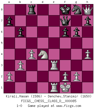 Last move : 1-0 2008 June 12 9:56:27 [Event "FICGS__CHESS__CLASS_D__000085"] [Site "FICGS"] [Date "2008.04.14"] [Round "1"] [White "Kirali,Hasan"] [Black "Denchev,Stanimir"] [Result "1-0"] [WhiteElo "1586"] [BlackElo "1650"] 1.e4 e5 2.d4 exd4 3.Qxd4 Nc6 4.Qe3 b6 5.Nc3 g6 6.Nd5 Bg7 7.Qg3 Be5 8.Bf4 d6 9.Bb5 Bd7 10.Bxc6 Bxc6 11.Bxe5 dxe5 12.Qxe5+ Kf8 13.Qxh8 Bxd5 14.exd5 Qe7+ 15.Kf1 f6 16.Re1 Qf7 17.c4 c6 18.dxc6 Rc8 19.b3 Rxc6 20.h4 Qd7 21.Rh3 Rc5 22.Rhe3 Rc8 23.Nf3 Qf7 24.Nd4 1-0 Centre game : Paulsen attack Player White won this chess game. Follow this game move after move (download)Bobby just drops the pieces and they fall on the right squares. (Miguel Najdorf) Garry Kasparov war erst in der Großmeister-Organisation GMA, dann in der Profischach-Vereinigung PCA, zum Schluss kehrte er wieder in den Schoß der FIDE zurück. Aber gut, manche Leute sind flexibel (Viswanathan Anand) Muchos jugadores de Ajedrez se sorprendían cuando después de la partida, Fischer explicaba con calma: 'Yo ya había analizado esta posibilidad' en una posición en la cual yo creía que no era posible de prever desde la apertura. (Mikhail Tal) Je ne suis pas le dernier à jouer lâchement des coups douteux pendant le zeïtnot de l'adversaire pour l'achever: en effet les coups qui font le plus peur sont ceux que l'on ne comprend pas. Je me fais souvent peur quand je joue. (Un professeur anonyme) Wisdom doesn't necessarily come with age. Sometimes age just shows up all by itself. (Tom Watson)