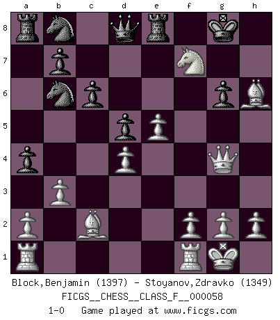 Last move : 1-0 2008 April 19 15:13:50 [Event "FICGS__CHESS__CLASS_F__000058"] [Site "FICGS"] [Date "2008.04.15"] [Round "1"] [White "Block,Benjamin"] [Black "Stoyanov,Zdravko"] [Result "1-0"] [WhiteElo "1397"] [BlackElo "1349"] 1.e4 e6 2.d4 h6 3.Bd3 a6 4.Nf3 Nf6 5.c4 d5 6.cxd5 exd5 7.e5 Nfd7 8.Nc3 Bb4 9.Qb3 Bxc3+ 10.Qxc3 c6 11.O-O Nb6 12.b3 O-O 13.Bc2 g6 14.Bxh6 Re8 15.Ng5 Bg4 16.Qg3 a5 17.Qxg4 a4 18.Nxf7 1-0 French defense Kingside Castling by player White (move 11) Kingside Castling by player Black (move 12) Player White won this chess game. Follow this game move after move (download)Let the perfectionist play postal. (Yasser Seirawan) Wenn Capablanka heute auf der Schachbühne erscheinen würde, hätte er ein halbes Jahr gebraucht um sich die Schachtheorie anzueignen. Und dann hätte er alles und jeden besiegt. (Mikhail Moiseyevich Botvinik) Yo he agregado estos principios a la ley: pongan los Caballos en acción antes de que los dos Alfiles sean desarrollados. (Emanuel Lasker) Aidez vos pièces, elles vous aideront. (Paul Morphy) Beta. Software undergoes beta testing shortly before it's released. Beta is latin for still doesn't work. (Anonymous)