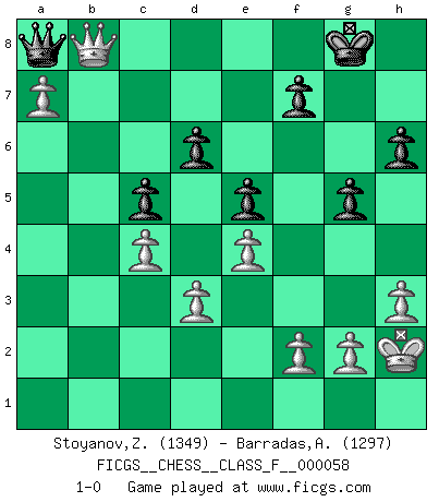Last move : 1-0 2008 May 15 20:45:33 [Event "FICGS__CHESS__CLASS_F__000058"] [Site "FICGS"] [Date "2008.04.15"] [Round "1"] [White "Stoyanov,Zdravko"] [Black "Barradas,Anderson"] [Result "1-0"] [WhiteElo "1349"] [BlackElo "1297"] 1.e4 e5 2.Nf3 Nf6 3.d3 d6 4.h3 Nc6 5.Bg5 Be7 6.Be2 O-O 7.O-O Be6 8.Nh4 Nd4 9.c4 Nxe2+ 10.Qxe2 Nd7 11.Bxe7 Qxe7 12.Nf3 c5 13.Nc3 a6 14.Qe3 Rab8 15.Ng5 h6 16.Nxe6 Qxe6 17.Nd5 Rbc8 18.a3 b5 19.b3 Rc6 20.a4 bxc4 21.bxc4 Rb8 22.a5 R6c8 23.Rab1 Rxb1 24.Rxb1 Kh8 25.Rb7 Rb8 26.Ra7 Rb1+ 27.Kh2 Nb8 28.Qg3 g5 29.Qf3 Nd7 30.Qh5 Kg7 31.Rxa6 Nb8 32.Ra7 Nc6 33.Ra8 Rb8 34.Ra6 Nb4 35.Nxb4 Rxb4 36.Ra8 Qd7 37.a6 Ra4 38.Qd1 Qc6 39.a7 Qxa8 40.Qxa4 Kf6 41.Qd7 Kg7 42.Qc7 Kg8 43.Qb8+ 1-0 Petrov's defense Kingside Castling by player Black (move 6) Kingside Castling by player White (move 7) Player White won this chess game. Follow this game move after move (download)The blunders are all there on the board, waiting to be made. (Savielly Tartakover) Matt entspricht nicht immer den Tatsachen. (Savielly Grigorievitsch Tartakower) No nos podemos resistir a la fascinación de un sacrificio ya que la pasión por los sacrificios es parte de la naturaleza de un jugador de Ajedrez. (Rudolf Spielman) Tout change constamment, y compris dans le monde des Echecs. (Botvinnik) Nothing is more important for teaching us to understand the concepts we have than constructing fictitious ones. (Ludwig Wittgenstein)
