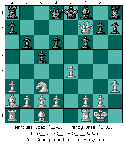 Last move : 1-0 2008 April 23 21:38:31 [Event "FICGS__CHESS__CLASS_F__000058"] [Site "FICGS"] [Date "2008.04.15"] [Round "1"] [White "Marques,Joao"] [Black "Percy,Dale"] [Result "1-0"] [WhiteElo "1346"] [BlackElo "1006"] 1.e4 e5 2.Nf3 f6 3.Bc4 Ne7 4.O-O Nbc6 5.a3 Na5 6.Ba2 d6 7.Nc3 Nec6 8.h3 Nd4 9.Nxd4 exd4 10.Qh5+ Ke7 11.Qxa5 b6 12.Qd5 Kd7 13.Qxd4 Ba6 14.Qa4+ c6 15.Qxa6 c5 16.Qb7+ Ke8 17.Qf7+ 1-0 Damiano's defense Kingside Castling by player White (move 4) Player White won this chess game. Follow this game move after move (download)Chess is a foolish expedient for making idle people believe they are doing something very clever when they are only wasting their time. (George Bernard Shaw) Schach ist das schnellste Spiel der Welt, weil man in jeder Sekunde Tausende von Gedanken ordnen muß. (Albert Einstein) Muchos se han convertido en Maestros de Ajedrez, nadie se ha convertido en el Maestro del Ajedrez. (Siegbert Tarrasch) Le pion, dans sa simplicité, marche droit devant lui, mais lorsqu'il prend, il le fait obliquement? Ainsi l'homme, tant qu'il reste pauvre, marche dans la droiture et vit honnêtement, mais lorsqu'il recherche les honneurs, il flatte, se parjure et, par les voies obliques, cherche une position supérieure sur l'échiquier du monde. (Jean de Galles) Creativity is allowing yourself to make mistakes. Art is knowing which ones to keep. (Scott Adams)