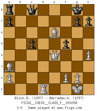 Last move : 1-0 2008 April 25 17:37:10 [Event "FICGS__CHESS__CLASS_F__000058"] [Site "FICGS"] [Date "2008.04.15"] [Round "1"] [White "Block,Benjamin"] [Black "Barradas,Anderson"] [Result "1-0"] [WhiteElo "1397"] [BlackElo "1297"] 1.d4 d5 2.Nf3 Nf6 3.c4 c6 4.Nbd2 e6 5.e3 Nbd7 6.Bd3 b6 7.O-O Ba6 8.Qa4 Qc8 9.b3 Bd6 10.Ba3 c5 11.e4 O-O 12.e5 dxc4 13.bxc4 Bc7 14.exf6 Nxf6 15.Ne5 Rd8 16.Nc6 Rd7 17.Ne5 Rxd4 18.Ndf3 b5 19.Qc2 Bxe5 20.Nxe5 bxc4 21.Nxc4 Bxc4 22.Bxc4 Ne4 23.Rfd1 Rxd1+ 24.Rxd1 Ng5 25.h4 Ne4 26.Qxe4 f5 27.Bxe6+ 1-0 Queen's pawn game Kingside Castling by player White (move 7) Kingside Castling by player Black (move 11) Player White won this chess game. Follow this game move after move (download)The Pawns are the soul of the game. (Francois Andre Danican Philidor) Lisa Lane, amerikanische Schachmeisterin, hatte Fischer einmal als stärksten lebenden Spieler bezeichnet. Antwort: Das ist richtig, aber Lisa Lane ist eigentlich nicht in der Lage, das zu beurteilen. (Robert James Fischer) Repentinamente, me resultaba obvio en mi analisis que yo había pasado por alto lo que Fischer había visto en el tablero con la mas grande facilidad. (Mikhail Botvinnik) Psychologiquement, tu dois avoir confiance en toi même, mais cette confiance doit être basée sur des faits. (Robert Fischer) Ah, beer! The cause of, and the solution to, all of life's problems. (Homer Simpson)