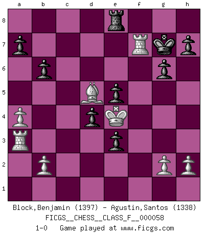 Last move : 1-0 2008 May 23 22:5:12 [Event "FICGS__CHESS__CLASS_F__000058"] [Site "FICGS"] [Date "2008.04.15"] [Round "1"] [White "Block,Benjamin"] [Black "Agustin,Santos"] [Result "1-0"] [WhiteElo "1397"] [BlackElo "1338"] 1.Nf3 d5 2.d4 Nf6 3.c4 c6 4.Nc3 dxc4 5.a4 Bf5 6.Ne5 e6 7.f3 Bb4 8.e4 Bxe4 9.fxe4 Nxe4 10.Bd2 Qxd4 11.Nxe4 Qxe4+ 12.Qe2 Bxd2+ 13.Kxd2 Qd5+ 14.Kc1 Na6 15.Nxc4 Rd8 16.Ra3 O-O 17.Qd2 Nc5 18.Qxd5 cxd5 19.Nd2 e5 20.Nb3 Ne4 21.Be2 f5 22.Kb1 Rc8 23.Rd1 d4 24.Nd2 Rc4 25.Bxc4+ Kh8 26.Nxe4 fxe4 27.Bd5 e3 28.Kc2 g6 29.Kd3 b6 30.Ke4 Re8 31.Rf1 Kg7 32.Rf7+ 1-0 Reti Opening Kingside Castling by player Black (move 16) Player White won this chess game. Follow this game move after move (download)There are two types of sacrifices: correct ones and mine. (Mikhail Tal) Im Schach nämlich geht es darum, daß Ich des Gegners klein zu kriegen, sein Ego zu zerbrechen und zu zermahlen, seine Selbstachtung zu zertreten und zu verscharren und seine ganze mißachtenswerte sogenannte Persönlichkeit ein für alle Mal tot zu hacken und zu zerstampfen und dadurch die menschliche Gesellschaft von einer stinkenden Pestbeule zu befreien. Es ist ein königliches Spiel. (Robert James Fischer) Siempre es mucho mejor sacrificar las piezas de tu oponente. (Savielly Tartakover) Je fais ceci parce que dans cinquante coups j'obtiendrai cela; je m'appelle Mikhail Moisevitch Botvinnik. (Botvinnik) A mistake is only a mistake if you let it happen twice. Otherwise it is a learning experience. (Daniel Parmet)