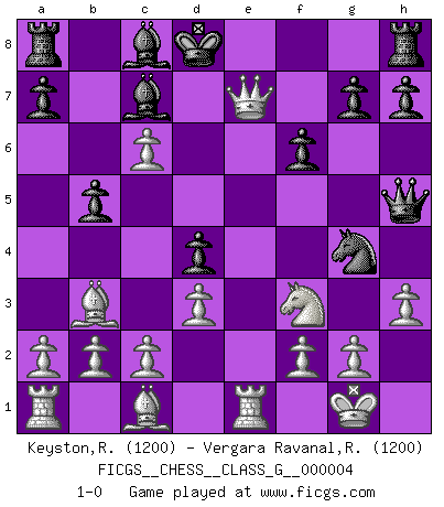 Last move : 1-0 2006 August 23 20:27:59 [Event "FICGS__CHESS__CLASS_G__000004"] [Site "FICGS"] [Date "2006.07.14"] [Round "1"] [White "Keyston,Ron"] [Black "Vergara Ravanal,Raul Andres"] [Result "1-0"] [WhiteElo "1200"] [BlackElo "1200"] 1.e4 e5 2.Nf3 Nc6 3.Bb5 Nd4 4.Nxd4 exd4 5.O-O c6 6.Bc4 b5 7.Bb3 Qh4 8.d3 Bd6 9.h3 Bc7 10.Nd2 d5 11.exd5 Nf6 12.Re1+ Kd8 13.Nf3 Qh5 14.dxc6 Ng4 15.Qe2 f6 16.Qe7+ 1-0 Ruy Lopez : Bird's defense Kingside Castling by player White (move 5) Player White won this chess game. Follow this game move after move (download)The boy (then a 12 year old boy named Anatoly Karpov) doesn't have a clue about Chess, and there's no future at all for him in this profession. (Mikhail Botvinnik) Jeder Fehler erscheint unglaublich dumm, wenn andre ihn begehen. (Georg Christoph Lichtenberg) El sobresalir en el Ajedrez es un signo de una mente intrigante. (Sir Arthur Conan Doyle) Toutes choses étant égales, c'est la conviction qui gagne. Alliée à une volonté de vaincre, elle sert de détonateur, suscite des idées, disperse les doutes et aide à penser clairement. (Robert Fischer) This is where the fun begins. (Anakin Skywalker in Star Wars ep.3)