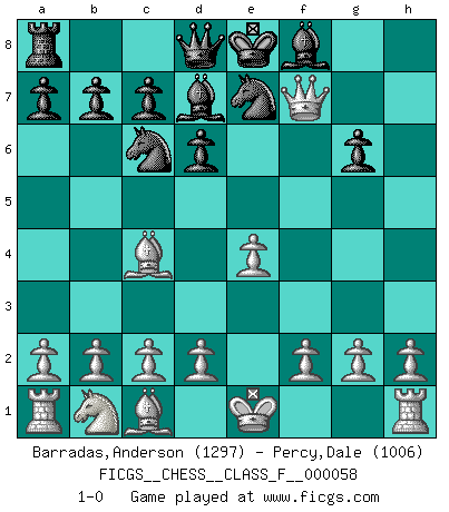 Last move : 1-0 2008 April 17 21:43:52 [Event "FICGS__CHESS__CLASS_F__000058"] [Site "FICGS"] [Date "2008.04.15"] [Round "1"] [White "Barradas,Anderson"] [Black "Percy,Dale"] [Result "1-0"] [WhiteElo "1297"] [BlackElo "1006"] 1.e4 e5 2.Nf3 f6 3.Nxe5 fxe5 4.Qh5+ g6 5.Qxe5+ Ne7 6.Qxh8 Nbc6 7.Qxh7 d6 8.Bc4 Bd7 9.Qf7+ 1-0 Damiano's defense Player White won this chess game. Follow this game move after move (download)The chessboard is the world, the pieces are the phenomena of the Universe, the rules of the game are what we call the laws of Nature and the player on the other side is hidden from us. (Thomas Huxley) Ich trinke, ich rauche, ich spiele, ich liebe Frauen aber Fernschach ist ein Laster, das ich nicht habe. (Mikhail Nekhemyevich Tal) Cuando tengas duda... ¡juega al Ajedrez!. (Tevis) En blitz, le Cavalier l'emporte sur le Fou. (Vlastimil Hort) Success without honor is an unseasoned dish; it will satisfy your hunger, but it won't taste good. (Joe Paterno)