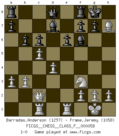 Last move : 1-0 2008 May 30 7:49:24 [Event "FICGS__CHESS__CLASS_F__000058"] [Site "FICGS"] [Date "2008.04.15"] [Round "1"] [White "Barradas,Anderson"] [Black "Frame,Jeremy"] [Result "1-0"] [WhiteElo "1297"] [BlackElo "1058"] 1.d4 d5 2.c4 e6 3.Nc3 Nf6 4.Bg5 Be7 5.Bxf6 Bxf6 6.Nf3 c6 7.e4 dxe4 8.Nxe4 Nd7 9.Rc1 Be7 10.a3 Nf6 11.Nxf6+ Bxf6 12.b3 Bd7 13.Bd3 O-O 14.O-O Qb6 15.c5 Qc7 16.Re1 Qd8 17.Qc2 b6 18.Bxh7+ 1-0 QGD : 4.Bg5 Be7 Kingside Castling by player Black (move 13) Kingside Castling by player White (move 14) Player White won this chess game. Follow this game move after move (download)I won't play with you anymore. You have insulted my friend. - When an opponent cursed himself for a blunder. (Miguel Najdorf) In Buenos Aires ist es nicht mein vorrangiges Ziel ein starkes Turnier zu organisieren, sondern ein Turnier für Gentlemen. Ich würde nie Kamsky einladen. Ich mag keine Probleme. (Miguel Najdorf) Si tu oponente no puede hacer nada activo, entonces no apures la posición; En vez de eso, dejalo estar sentado ahí, sufriendo y rogandote por un empate. (Jeremy Silman) Le succès, c'est être capable d'aller d'échec en échec sans perdre son enthousiasme. (Winston Churchill) Wisdom is the reward you get for a lifetime of listening when you'd have preferred to talk. (Doug Larson)