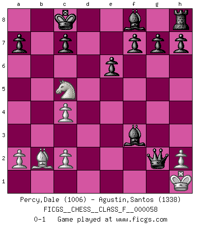 Last move : 0-1 2008 June 11 4:4:7 [Event "FICGS__CHESS__CLASS_F__000058"] [Site "FICGS"] [Date "2008.04.15"] [Round "1"] [White "Percy,Dale"] [Black "Agustin,Santos"] [Result "0-1"] [WhiteElo "1006"] [BlackElo "1338"] 1.e4 e6 2.Nf3 d5 3.Ne5 Nd7 4.d4 dxe4 5.Nd2 Nxe5 6.dxe5 Qd5 7.b3 Qxe5 8.Rb1 Bd7 9.Bb2 Qf5 10.Bc4 O-O-O 11.Qe2 b5 12.Nxe4 bxc4 13.bxc4 Bc6 14.f3 Nf6 15.g4 Nxg4 16.O-O Qg6 17.Nc5 Ne5 18.Kh1 Nxf3 19.Rxf3 Rd2 20.Re1 Rxe2 21.Rxe2 Bxf3+ 22.Rg2 Qxg2+ 0-1 French defense Queenside Castling by player Black (move 10) Kingside Castling by player White (move 16) Player Black won this chess game. Follow this game move after move (download)The isolated Pawn casts gloom over the entire chessboard. (Aaron Nimzovich) Ich kämpfe solange mein Gegner einen Fehler machen kann. (Emanuel Lasker) El Ajedrez es realmente noventa y nueve por ciento calculación. (Soltis) C'est une question de caractère, Beaucoup de gens perdent leur motivation très vite. D'autres, ils sont rares, peuvent la conserver très longtemps. J'aime les échecs, encore aujourd'hui je suis heureux d'analyser des parties. J'aime toujours gagner, je déteste encore perdre. Bien jouer est important pour mon intégrité intellectuelle et morale. Et puis les échecs vivent en ce moment une période historique grâce à Internet. Ils se développent dans les systèmes éducatifs à travers le monde. Ils sortent de leur ghetto, et c'est mon rôle de mener à bien cette révolution. (Gary Kasparov) The next best thing to gambling and winning is gambling and loosing. (Nick Dandalos)