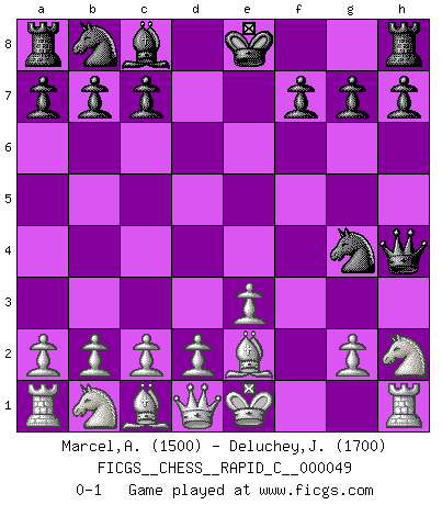 Last move : 0-1 2008 April 17 20:24:2 [Event "FICGS__CHESS__RAPID_C__000049"] [Site "FICGS"] [Date "2008.04.15"] [Round "1"] [White "Marcel,Alexis"] [Black "Deluchey,Jean-Philippe"] [Result "0-1"] [WhiteElo "1500"] [BlackElo "1700"] 1.f4 e5 2.fxe5 d6 3.exd6 Bxd6 4.Nf3 Nf6 5.e3 Ng4 6.Be2 Bxh2 7.Nxh2 Qh4+ 0-1 Bird : From gambit Player Black won this chess game. Follow this game move after move (download)It is not a move, even the best move that you must seek, but a realizable plan. (Eugene Znosko-Borovsky) Herr Iljumschinow ist ein etwas merkwürdiger Geschäftsmann: Er arbeitet zusammen mit Leuten wie Muammar al-Gaddafi; früher ist das Saddam Hussein gewesen. (Joel Lautier) Todo se encuentra en un estado de flujo y esto incluye al mundo del Ajedrez. (Mikhail Botvinnik) Aidez vos pièces, elles vous aideront. (Paul Morphy) Have no fear of perfection - you'll never reach it. (Salvador Dali)