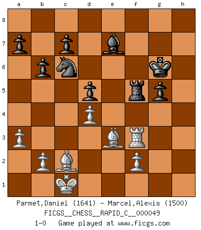 Last move : 1-0 2008 May 21 14:42:22 [Event "FICGS__CHESS__RAPID_C__000049"] [Site "FICGS"] [Date "2008.04.15"] [Round "1"] [White "Parmet,Daniel"] [Black "Marcel,Alexis"] [Result "1-0"] [WhiteElo "1641"] [BlackElo "1500"] 1.d4 f5 2.Nf3 Nf6 3.c4 e6 4.Nc3 Be7 5.Qc2 O-O 6.e4 fxe4 7.Nxe4 b6 8.Bd3 Bb7 9.Nxf6+ Bxf6 10.Bxh7+ Kh8 11.Be3 Bxf3 12.gxf3 Nc6 13.O-O-O Nb4 14.Qg6 Qe8 15.a3 Qxg6 16.Bxg6 Nc6 17.Be4 Rad8 18.h4 d5 19.cxd5 exd5 20.Bc2 Be7 21.h5 Rxf3 22.h6 g5 23.Rdg1 Rg8 24.h7 Rg7 25.Bb3 Rf5 26.Rg3 Rxh7 27.Rxh7+ Kxh7 28.Bc2 Kg6 29.Rf3 1-0 Dutch Kingside Castling by player Black (move 5) Queenside Castling by player White (move 13) Player White won this chess game. Follow this game move after move (download)You know, comrade Pachman, I don't enjoy being a Minister, I would rather play Chess like you. (Che Guevara) Das Zentrum ist der Balkan des Schachbretts - Kriegshandlungen können in jedem Moment ausbrechen. (Aaron Nimzowitsch) El Ajedrez es un expediente tonto que hace creer a la gente inactiva que hacen una cosa muy astuta cuando solamente estan perdiendo su tiempo. (George Bernard Shaw) Le moment que je préfère le plus dans une rencontre, c'est celui où je sens que la personnalité de l'adversaire se brise. (Robert Fischer) Be who you are, and say what you feel because those who mind don't matter, and those who matter don't mind. (Dr Seuss)