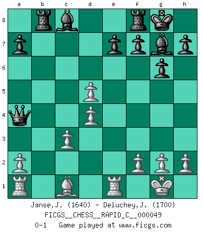 Last move : 0-1 2008 April 17 9:51:29 [Event "FICGS__CHESS__RAPID_C__000049"] [Site "FICGS"] [Date "2008.04.15"] [Round "1"] [White "Janse,Japie"] [Black "Deluchey,Jean-Philippe"] [Result "0-1"] [WhiteElo "1640"] [BlackElo "1700"] 1.e4 c5 2.Nf3 g6 3.d4 cxd4 4.Nxd4 Bg7 5.c3 Nc6 6.Bc4 Nxd4 7.cxd4 d5 8.Bxd5 Nf6 9.Nc3 Nxd5 10.exd5 O-O 11.O-O Qb6 12.Na4 Qd6 13.Re1 b5 14.Nc3 b4 15.Nb5 Qd7 16.Qa4 Rb8 17.Nc3 bxc3 18.bxc3 Qxa4 0-1 Sicilian : Hungarian variation Kingside Castling by player Black (move 10) Kingside Castling by player White (move 11) Player Black won this chess game. Follow this game move after move (download)A good player is always lucky. (Jose Raul Capablanca) Über Karpov: Er war und ist ein Vertreter der russischen Reaktionäre. Das steckt tief in seiner Seele, wehalb ich nicht nett mit ihm umgehen kann. (Viktor Kortschnoi) Siempre es mucho mejor sacrificar las piezas de tu oponente. (Savielly Tartakover) Les échecs sont un jeu par leur forme, un art par leur essence et une science par sa difficulté d'acquisition. Ils peuvent vous procurer autant de plaisir qu'un bon livre ou une belle musique, mais vous n'aurez une réelle joie que si vous arrivez à bien jouer. (Tigran Petrosian) Art is the triumph over chaos. (John Cheever)