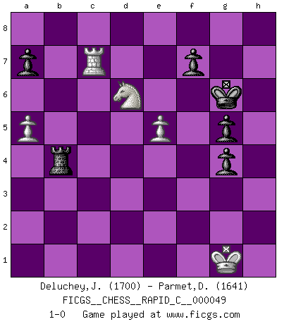 Last move : 1-0 2008 June 18 7:15:4 [Event "FICGS__CHESS__RAPID_C__000049"] [Site "FICGS"] [Date "2008.04.15"] [Round "1"] [White "Deluchey,Jean-Philippe"] [Black "Parmet,Daniel"] [Result "1-0"] [WhiteElo "1700"] [BlackElo "1641"] 1.e4 e5 2.Nc3 Nf6 3.f4 d5 4.exd5 Nxd5 5.Nxd5 Qxd5 6.fxe5 Qxe5+ 7.Qe2 Bd6 8.Qxe5+ Bxe5 9.Nf3 Bf6 10.Bc4 Nc6 11.c3 O-O 12.d4 Re8+ 13.Kf2 Na5 14.Bd3 Be6 15.Re1 Bc4 16.Be4 Re7 17.Bf4 Rae8 18.Nd2 g5 19.Bg3 Be6 20.b4 Nc6 21.Bxc6 bxc6 22.Ne4 Kg7 23.a4 h5 24.Be5 Bxe5 25.dxe5 Kg6 26.Re3 Rd8 27.Rae1 Bc4 28.Nf6 Rd2+ 29.Kg1 Ra2 30.a5 c5 31.h4 cxb4 32.g4 hxg4 33.h5+ Kf5 34.h6 Kg6 35.h7 Kg7 36.Rd1 Bb5 37.Rd8 Be8 38.cxb4 Rb2 39.Rxe8 Rxe8 40.Nxe8+ Kxh7 41.Rc3 Rxb4 42.Rxc7 Kg6 43.Nd6 1-0 Vienna gambit Kingside Castling by player Black (move 11) Player White won this chess game. Follow this game move after move (download)I don't believe in psychology. I believe in good moves. (Bobby Fischer) Ein Kibitz ist einer, der deinem Gegner gute Ratschläge gibt. (Andrew Soltis) Los Peones son nacidos libres, y aún así, se encuentran encadenados por todos lados. (Rick Kennedy) Ce qui caractérise les parties de combat, c'est que si le défenseur a constamment de difficiles problèmes à résoudre, l'attaquant doit chercher sans relâche de nouvelles possibilités d'attaque. (Koblentz) Waiting for chance ? Play in casinos. (FICGS proverb)