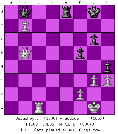 Last move : 1-0 2008 May 8 8:31:26 [Event "FICGS__CHESS__RAPID_C__000049"] [Site "FICGS"] [Date "2008.04.15"] [Round "1"] [White "Deluchey,Jean-Philippe"] [Black "Gouldar,Frances"] [Result "1-0"] [WhiteElo "1700"] [BlackElo "1659"] 1.e4 c5 2.Nf3 d6 3.d4 cxd4 4.Qxd4 Nc6 5.Bb5 Bd7 6.Bxc6 Bxc6 7.c4 e6 8.Nc3 Nf6 9.O-O Be7 10.Re1 O-O 11.b3 a6 12.Bb2 b5 13.a3 bxc4 14.Qxc4 Bb7 15.Rac1 d5 16.exd5 Nxd5 17.Nxd5 Bxd5 18.Qg4 Bf6 19.Bxf6 Qxf6 20.Ne5 Qe7 21.b4 a5 22.Nd3 axb4 23.axb4 Qf6 24.Ne5 Ra2 25.Qg3 Rfa8 26.b5 Qe7 27.Ng4 h5 28.Ne3 Qf6 29.Nxd5 exd5 30.Rf1 d4 31.Qb3 Qe6 32.Qf3 Qe2 33.Qd5 Re8 34.b6 d3 35.b7 Rb2 36.g3 Qe7 37.Rc8 d2 38.Qc6 Kf8 39.Kg2 f5 40.Kg1 h4 41.h3 Qe5 42.Qd7 g6 43.Rc7 Qe7 44.Qxd2 Qxc7 45.Qxb2 Kg8 46.Rc1 Qb8 47.Qb5 1-0 Sicilian, Chekhover variation Kingside Castling by player White (move 9) Kingside Castling by player Black (move 10) Player White won this chess game. Follow this game move after move (download)It's always better to sacrifice your opponent's men. (Savielly Tartakover) Der Freibauer hat für mich eine Seele, genau wie der Mensch, Wünsche, die unerkannt in ihm schlummern, und Befürchtungen, von deren Existenz er selbst kaum ahnt. (Aaron Nimzowitsch) No puedes jugar al Ajedrez si eres de corazón noble. (Proverbio Francés) Je ne crois pas en la psychologie, je crois aux bons coups. (Robert Fischer) All battles are fought by scared men who'd rather be someplace else. (John Wayne in the movie In harm's way)