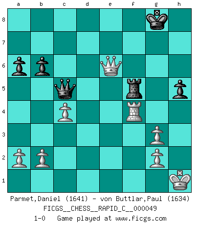 Last move : 1-0 2008 July 31 14:20:27 [Event "FICGS__CHESS__RAPID_C__000049"] [Site "FICGS"] [Date "2008.04.15"] [Round "1"] [White "Parmet,Daniel"] [Black "von Buttlar,Paul"] [Result "1-0"] [WhiteElo "1641"] [BlackElo "1634"] 1.d4 d5 2.Nf3 c6 3.c4 e6 4.Nc3 Bd6 5.e4 dxe4 6.Nxe4 Nf6 7.Bd3 Nxe4 8.Bxe4 Nd7 9.O-O Nf6 10.Bc2 b6 11.Re1 Bb7 12.Qe2 O-O 13.Bg5 h6 14.Bh4 c5 15.Ne5 cxd4 16.Qd3 g5 17.Ng4 Bxh2+ 18.Kh1 Kg7 19.Rxe6 Ne4 20.Rxe4 Bxe4 21.Qxe4 f5 22.Qd3 Bf4 23.Bg3 Bxg3 24.fxg3 h5 25.Ne5 Qd6 26.Nf3 Rad8 27.Nxg5 a6 28.Rf1 Qe5 29.Rf4 Rd6 30.Nf3 Qc5 31.Nxd4 Kg8 32.Qe3 Rdf6 33.Bxf5 Rxf5 34.Nxf5 Rxf5 35.Qe6+ 1-0 Queen's pawn game Kingside Castling by player White (move 9) Kingside Castling by player Black (move 12) Player White won this chess game. Follow this game move after move (download)The hallmark of the artist is simplicity. (Larry Evans) Kostenjuk hat keinen Sexappeal. (Loek van Wely) Bobby Fischer es el jugador de Ajedrez mas grande que jamás haya existido. (Ken Smith) La vérité est comme le meilleur coup aux échecs : elle existe, mais il faut la chercher. (Arturo Perez-Reverte) Either move or be moved. (Ezra Pound)