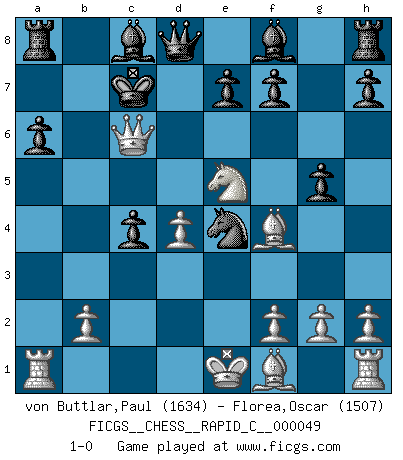 Last move : 1-0 2008 April 24 2:1:39 [Event "FICGS__CHESS__RAPID_C__000049"] [Site "FICGS"] [Date "2008.04.15"] [Round "1"] [White "von Buttlar,Paul"] [Black "Florea,Oscar"] [Result "1-0"] [WhiteElo "1634"] [BlackElo "1507"] 1.c4 c6 2.Nc3 d5 3.d4 Nf6 4.Bf4 dxc4 5.e4 b5 6.a4 a6 7.axb5 cxb5 8.Nxb5 Nxe4 9.Nc7+ Kd7 10.Qa4+ Nc6 11.Nf3 g5 12.Ne5+ Kxc7 13.Qxc6+ 1-0 English : Caro-Kann defensive system Player White won this chess game. Follow this game move after move (download)Chess is everything: art, science and sport. (Anatoly Karpov) Ein Springer auf f6 gegen die eigene Rochadestellung ist schlimmer als ein rostiger Nagel im Knie. (Efim Bogoljubov) Fischer deseaba darle a los Rusos una sopa de su propia medicina. (Larry Evans) Nous sommes les pions de la mystérieuse partie d'Echecs jouée par Dieu. Il nous déplace, nous arrête, nous pousse encore, puis nous lance un à un dans la boîte du Néant. Epitaphe sur la tombe de David Janowsky (1868-1927). Hardware: the parts of a computer that can be kicked. (Jeff Persis)