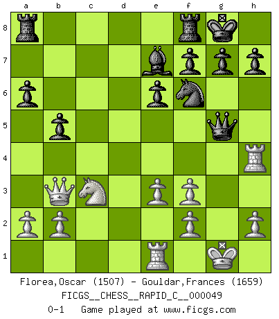 Last move : 0-1 2008 April 28 5:33:2 [Event "FICGS__CHESS__RAPID_C__000049"] [Site "FICGS"] [Date "2008.04.15"] [Round "1"] [White "Florea,Oscar"] [Black "Gouldar,Frances"] [Result "0-1"] [WhiteElo "1507"] [BlackElo "1659"] 1.d4 d5 2.c4 e6 3.Nc3 Nf6 4.Bg5 Be7 5.Nf3 O-O 6.e3 Nbd7 7.Bd3 dxc4 8.Bxc4 b6 9.O-O Bb7 10.Re1 c5 11.dxc5 Nxc5 12.Qc2 Bxf3 13.gxf3 a6 14.Rad1 Qc8 15.Rd4 b5 16.Bb3 Nxb3 17.Qxb3 Qc5 18.Rh4 Qxg5+ 0-1 QGD : 4.Bg5 Be7 Kingside Castling by player Black (move 5) Kingside Castling by player White (move 9) Player Black won this chess game. Follow this game move after move (download)Chess is imagination. (David Bronstein) Wenn es im Universum noch irgendwo intelligente Lebewesen gibt, dann kennen sie Go. (Emanuel Lasker) Los problemas de Ajedrez exigen del compositor las mismas virtudes que caracterizan todo el arte de valor: originalidad, invención, concisión, armonía, complejidad e insinceridad explendida. (Vladimir Nabokov) Une platitude souvent récitée à propos des Echecs est qu'une des choses les plus difficiles à réaliser est de gagner une position gagnante. Cela ne manque pas de sens mais, pour ma part, j'ai toujours trouvé plus difficile de gagner une position perdante. (Tim Krabbe) The only sure thing about luck is that it will change. (Wilson Mizner)