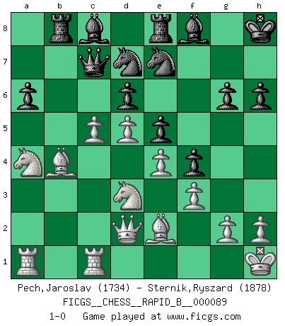 Last move : 1-0 2008 June 26 18:3:42 [Event "FICGS__CHESS__RAPID_B__000089"] [Site "FICGS"] [Date "2008.04.16"] [Round "1"] [White "Pech,Jaroslav"] [Black "Sternik,Ryszard"] [Result "1-0"] [WhiteElo "1734"] [BlackElo "1878"] 1.d4 Nf6 2.c4 g6 3.Nc3 Bg7 4.e4 d6 5.Nf3 O-O 6.Be2 e5 7.O-O Nc6 8.d5 Ne7 9.Ne1 Nd7 10.Nd3 f5 11.Bd2 Kh8 12.f3 f4 13.Qc2 c5 14.a4 a6 15.a5 b6 16.axb6 Qxb6 17.Na4 Qa7 18.Ba5 Rb8 19.Kh1 Re8 20.b4 cxb4 21.Bxb4 Qc7 22.Qd2 h6 23.Rfc1 Bf8 24.c5 1-0 King's Indian : Orthodox, Aronin-Taimanov variation (Yugoslav attack / Mar del Plata variation) Kingside Castling by player Black (move 5) Kingside Castling by player White (move 7) Player White won this chess game. Follow this game move after move (download)The Chess pieces are the block alphabet which shapes thoughts; and these thoughts, although making a visual design on the chessboard, express their beauty abstractly, like a poem. (Marcel Duchamp) In Buenos Aires ist es nicht mein vorrangiges Ziel ein starkes Turnier zu organisieren, sondern ein Turnier für Gentlemen. Ich würde nie Kamsky einladen. Ich mag keine Probleme. (Miguel Najdorf) Las piezas de Ajedrez son los bloques del alfabeto que moldean los pensamientos; y esos pensamientos, aunque hagan un diseño visual en el tablero, expresan abstractamente su belleza como un poema. (Marcel Duchamp) Karpov est une pièce de musée. (Garry Kasparov) At last I discovered the true beauty of chess. So I proposed to her. (Dinesh De Silva)