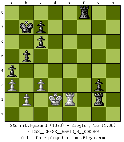 Last move : 0-1 2008 May 19 21:38:49 [Event "FICGS__CHESS__RAPID_B__000089"] [Site "FICGS"] [Date "2008.04.16"] [Round "1"] [White "Sternik,Ryszard"] [Black "Ziegler,Pio"] [Result "0-1"] [WhiteElo "1878"] [BlackElo "1796"] 1.e4 e5 2.Nf3 Nc6 3.Bb5 a6 4.Bxc6 dxc6 5.O-O f6 6.d4 Bg4 7.c3 Bd6 8.Nbd2 Qe7 9.Nc4 O-O-O 10.h3 Bh5 11.Na5 Bc5 12.Qb3 Bb6 13.Nc4 Ba7 14.Nfd2 Bf7 15.dxe5 fxe5 16.Qa4 Kb8 17.Qa5 Nf6 18.Qxe5 Rhe8 19.Qxe7 Rxe7 20.Re1 Bxc4 21.Nxc4 Rxe4 22.Ne3 R4e8 23.Kf1 Ne4 24.Re2 Rf8 25.Ke1 Rde8 26.Rb1 h5 27.Bd2 g6 28.Rd1 g5 29.Bc1 Kc8 30.a3 Rf7 31.Rd3 Nc5 32.Rd1 Nb3 33.Bd2 Bc5 34.Bc1 b5 35.Bd2 Kb7 36.Bc1 a5 37.Bd2 a4 38.Bc1 Ba7 39.Bd2 Rfe7 40.g4 hxg4 41.hxg4 Re4 42.Kf1 Rf8 43.Ke1 Bb6 44.Rb1 Ref4 45.Rd1 Nc5 46.Bc1 Ne4 47.Rd7 Nxf2 48.Re7 Nd3+ 49.Kd2 Nxc1 50.Kxc1 Bxe3+ 51.R7xe3 Rxg4 52.Rh2 Rg1+ 53.Kd2 g4 54.R3e2 g3 55.Rhg2 Rxg2 0-1 Ruy Lopez : Exchange, Gligoric variation Kingside Castling by player White (move 5) Queenside Castling by player Black (move 9) Player Black won this chess game. Follow this game move after move (download)Chess is war over the board. The object is to crush the opponents mind. (Bobby Fischer) Ich verstehe Aljechins Kombinationen ganz gut; aber woher er diese Angriffschancen bekommt und wie er die Eröffnung behandelt das ist für mich ein Buch mit sieben Siegeln. (Rudolf Spielmann) El ganar no lo es todo... pero el perder es nada. (Mednis) Il n'y a pas de prix trop élevé au scalp de l'ennemi. (Koblentz) I teach you to lie, cheat and steal, and as soon as my back's turned you wait in line ? (Gregory House, House M.D.)