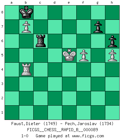 Last move : 1-0 2008 September 18 13:34:29 [Event "FICGS__CHESS__RAPID_B__000089"] [Site "FICGS"] [Date "2008.04.16"] [Round "1"] [White "Faust,Dieter"] [Black "Pech,Jaroslav"] [Result "1-0"] [WhiteElo "1749"] [BlackElo "1734"] 1.e4 e5 2.Nf3 Nc6 3.Bc4 Nf6 4.Ng5 d5 5.exd5 Na5 6.Bb5+ c6 7.dxc6 bxc6 8.Qf3 Qc7 9.Bd3 Be7 10.O-O O-O 11.Nc3 h6 12.Nge4 Nxe4 13.Bxe4 Rb8 14.Bf5 Bxf5 15.Qxf5 c5 16.Nd5 Qd6 17.Nxe7+ Qxe7 18.d3 Nc6 19.c3 Rfd8 20.Qe4 Qe6 21.b3 f5 22.Qe2 Qd5 23.Qh5 Qf7 24.Qxf7+ Kxf7 25.Rd1 Rb7 26.Ba3 Rbd7 27.Bxc5 Rxd3 28.Rxd3 Rxd3 29.Rc1 Rd2 30.a4 Na5 31.b4 Nb3 32.Be3 Rd3 33.Rb1 Rxc3 34.b5 Nc5 35.a5 f4 36.Bxc5 Rxc5 37.b6 axb6 38.axb6 Rc8 39.b7 Rb8 40.f3 Ke6 41.Kf2 Kd6 42.Ke2 Kc7 43.Kd3 Rd8+ 44.Ke4 Kb8 45.Kxe5 Rd2 46.Kxf4 Rxg2 47.h4 Rg6 48.Rb3 Ra6 49.Kf5 Rf6+ 50.Ke5 Ra6 51.Rb4 Ra5+ 52.Kf4 Rc5 53.Kg4 Rd5 54.h5 Rg5+ 55.Kh4 Rd5 56.f4 Rd8 57.Rb5 Rd1 58.Kg4 Rh1 59.Rb3 Rd1 60.Kf5 Rd6 61.Ke5 Rf6 62.Rb4 Rc6 63.f5 1-0 Two knights defense Kingside Castling by player White (move 10) Kingside Castling by player Black (move 10) 10 pieces endgame at move 46 : White KRPPPP , Black KRPP WHITE : King + 1 Rook 4 Pawns BLACK : King + 1 Rook 2 Pawns 9 pieces endgame at move 46 : White KRPPP , Black KRPP WHITE : King + 1 Rook 3 Pawns BLACK : King + 1 Rook 2 Pawns Player White won this chess game. Follow this game move after move (download)Tactics flow from a superior position. (Bobby Fischer) Über die Verhaftung Bobby Fischers: Warum es die Bush-Administration für nötig befindet einen 61 Jahre alten Mann zu hetzten, der für niemanden ausser sich selbste eine Gefahr darstellt ist ein Rätsel. (Nigel Short) Los Peones son nacidos libres, y aún así, se encuentran por doquier encadenados. (Rick Kennedy) Un millionnaire : 'Monsieur Steinitz ! Vous ne participez aux tournois que pour l'argent, alors que moi je n'y viens que pour l'honneur.' Steinitz : 'Chacun joue pour ce qu'il n'a pas'... If you are going through hell, keep going. (Winston Churchill)