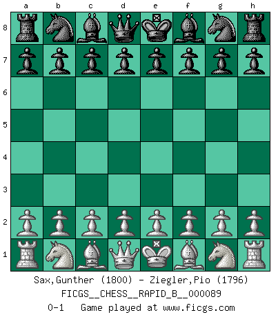 Last move : 0-1 2008 May 16 10:5:7 [Event "FICGS__CHESS__RAPID_B__000089"] [Site "FICGS"] [Date "2008.04.16"] [Round "1"] [White "Sax,Gunther"] [Black "Ziegler,Pio"] [Result "0-1"] [WhiteElo "1800"] [BlackElo "1796"] 0-1 This chess game has been lost on time (started : 2008.04.16 3:55:27) Player Black won this chess game. Follow this game move after move (download)A man that will take back a move at Chess will pick a pocket. (Richard Fenton) Computer sind die einzigen Gegner, die nicht immer eine Ausrede auf Lager haben, wenn sie gegen mich verlieren. (Robert James Fischer) El Ajedrez lo es todo: arte, ciencia y deporte. (Anatoly Karpov) Même si vous avez un bon coup à faire, regardez toujours s'il n'y en a pas un qui lui soit préférable. (Pedro Damiano) If we don't succeed, we run the risk of failure. (George W. Bush)