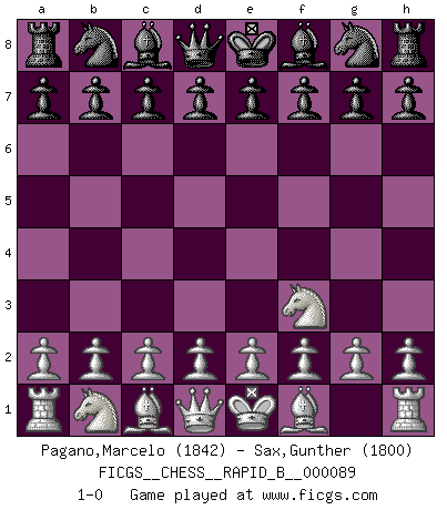 Last move : 1-0 2008 May 16 10:5:7 [Event "FICGS__CHESS__RAPID_B__000089"] [Site "FICGS"] [Date "2008.04.16"] [Round "1"] [White "Pagano,Marcelo"] [Black "Sax,Gunther"] [Result "1-0"] [WhiteElo "1842"] [BlackElo "1800"] 1.Nf3 1-0 This chess game has been lost on time (started : 2008.04.16 3:55:27) Reti Opening Player White won this chess game. Follow this game move after move (download)The stomach is an essential part of the Chess master. (Bent Larsen) Drei Punkte vor allen anderen ist wie einer, der im weißen Anzug posiert, während der Rest in Müllsäcke gekleidet dasteht. (Viktor Kortschnoi) Ayuda a tus piezas para que ellas te puedan ayudar. (Paul Morphy) Il n'y a pas eu de défaite parce que je ne crois pas que cet ordinateur ait jamais existé. IBM a triché en refusant d'imprimer les modes de recherche de la machine. C'est évident, pendant le match, des coups décisifs ont été joués par des êtres humains. Aujourd'hui, les meilleurs spécialistes en informatique ne peuvent toujours pas expliquer comment Deep-Blue a pu jouer contre la logique des ordinateurs. IBM a gagné une guerre de communication, mais ils sont incapables de prouver que l'ordinateur a gagné tout seul. (Garry Kasparov) Bobby never cared about money, though. His only desire was to prove that his choices were correct: He wanted chess to be important because he was a chess player, and he wanted to be important. Bobby knew money was important, but he didn't have a clue why, outside of clothes and status. The only way he could accomplish what he wanted was to fight for a lot of money. Once he got it, he gave it away. He did not know how to spend it. And once he'd become champion, after, essentially, sacrificing his life for it, he didn't know how to spend his time. (Bob Wade)