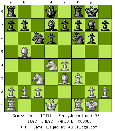 Last move : 0-1 2008 June 25 13:22:22 [Event "FICGS__CHESS__RAPID_B__000089"] [Site "FICGS"] [Date "2008.04.16"] [Round "1"] [White "Gomez,Jose"] [Black "Pech,Jaroslav"] [Result "0-1"] [WhiteElo "1747"] [BlackElo "1734"] 1.e4 c5 2.Nf3 Nc6 3.Nc3 d6 4.d4 cxd4 5.Nxd4 Nf6 6.Bb5 Bd7 7.O-O g6 8.Be3 Bg7 9.f3 O-O 0-1 This chess game has been lost on time (started : 2008.04.16 3:55:27) Sicilian defense Kingside Castling by player White (move 7) Kingside Castling by player Black (move 9) Player Black won this chess game. Follow this game move after move (download)Bobby Fischer's current state of mind is indeed a tragedy. One of the world's greatest Chess players - the pride and sorrow of American Chess. (Frank Brady) Man gibt nur Pakete auf. (Paul Keres) Durante una competencia de Ajedrez, un Maestro de Ajedrez deberá ser una combinación de presa de caza y un Monge. (Alexander Alekhine) Si je n'étais pas joueur d'échecs, je serais le meilleur dans quelque chose d'autre. (Anatoli Karpov) The message for business people contemplating their place in the cyberspace is simple and direct: get linked or get lost. (Vic Sussman and Kenan Pollack)