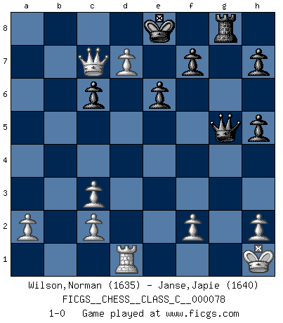 Last move : 1-0 2008 May 8 13:13:45 [Event "FICGS__CHESS__CLASS_C__000078"] [Site "FICGS"] [Date "2008.04.18"] [Round "1"] [White "Wilson,Norman"] [Black "Janse,Japie"] [Result "1-0"] [WhiteElo "1635"] [BlackElo "1640"] 1.e4 c5 2.Nf3 Nc6 3.d4 cxd4 4.Nxd4 e6 5.Nc3 a6 6.Be2 Bb4 7.Nxc6 Bxc3+ 8.bxc3 bxc6 9.Qd6 Qe7 10.Qg3 g6 11.O-O Nf6 12.e5 Nh5 13.Bxh5 gxh5 14.Bh6 Bb7 15.Rab1 O-O-O 16.Bg5 Qc5 17.Rb3 Rdg8 18.Rfb1 Ba8 19.Qd3 Rxg5 20.Qxa6+ Kc7 21.Rb7+ Bxb7 22.Qxb7+ Kd8 23.Rd1 d5 24.exd6 Rxg2+ 25.Kxg2 Qg5+ 26.Kh1 Rg8 27.Qc7+ Ke8 28.d7+ 1-0 Sicilian defense Kingside Castling by player White (move 11) Queenside Castling by player Black (move 15) Player White won this chess game. Follow this game move after move (download)I'm not a materialistic person, in that, I don't suffer the lack or loss of money. The absence of worldly goods I don't look back on. For Chess is a way I can be as materialistic as I want without having to sell my soul. (Jamie Walter Adams) Die meiste Zeit treffe ich auf Gegner, die meine Enkel sein könnten. Ich bin da, um ihnen zu zeigen, dass sie von mir noch einiges lernen können. (Viktor Kortschnoi) Vive, pierde y aprende al observar a tu oponente como ganar. (Amber Steenbock) Ce qui est bien, c'est d'avoir tout un tas de pièces en prise : l'adversaire ne peut en prendre qu'une à la fois. Cité par Thierry Audin. After growing wildly for years, the field of computing appears to be reaching its infancy. (John Pierce)